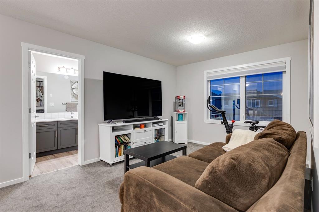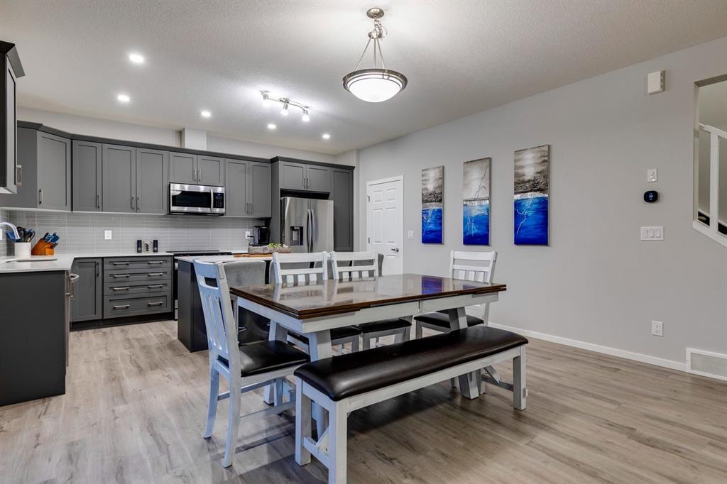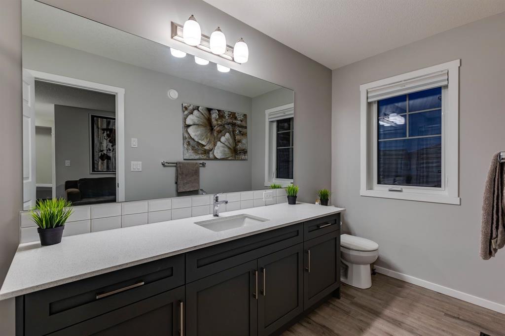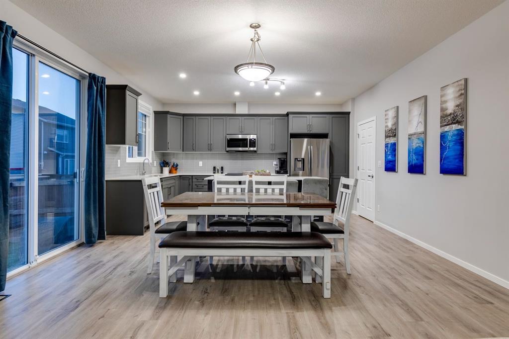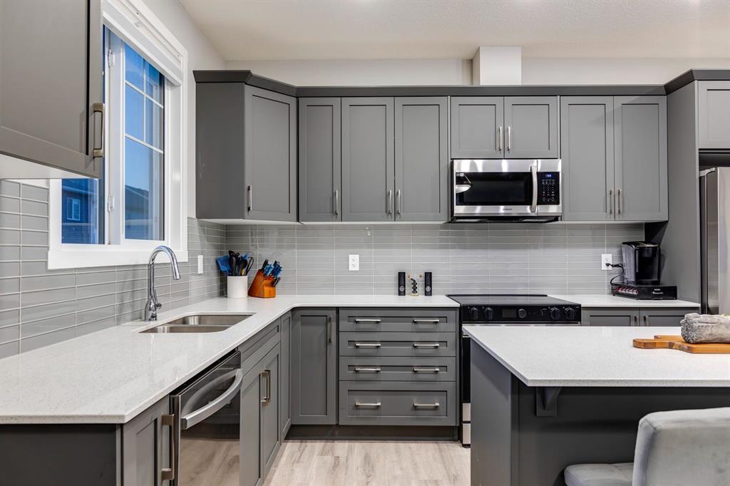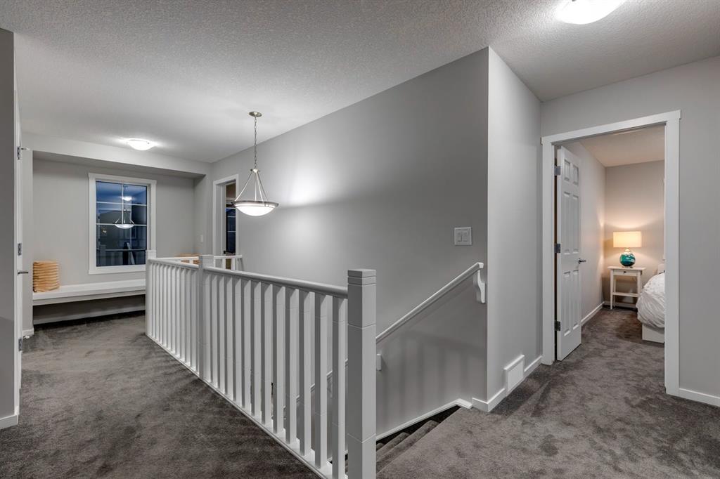 A gorgeous, almost-new home tucked on a quiet corner lot in one of Airdrie's most sought-after communities. With a desirable west-facing backyard that captures the afternoon and evening sun, this turnkey property is thoughtfully designed and loaded with upgrades inside and out. From the moment you arrive, the striking exterior stands out with Gemstone soffit lighting, a welcoming front veranda, and stylish architectural details that make a strong first impression. Step inside to find high-end luxury vinyl plank flooring, soaring 9-foot ceilings, and a bright, open-concept floor plan filled with natural light streaming through the many windows. At the heart of the home, the chef-inspired kitchen impresses with elegant matte grey cabinetry, sparkling quartz countertops, a large central island with seating, and premium appliances. The thoughtful design continues with ~ convenient side entrance, perfect for future basement development or private access. Relax and entertain in the spacious living area featuring a sleek linear fireplace framed by custom finishes - ideal for cozy evenings. Upstairs, a generous bonus room offers additional living space for movie nights, a playroom, or a home office. The home features three well-sized bedrooms, including a tranquil primary retreat with a beautifully finished en suite and walk-in closet. Upper-level laundry adds everyday convenience and includes upper level laundry. Outside, the fully fenced west-facing yard is ready for summer fun, complete with a storage shed and plenty of room to garden, play, or relax in the sunshine. Central air conditioning keeps the home cool and comfortable year-round. Located in a family-friendly area, this home is close to all levels of schools, parks, and everyday amenities, with easy highway access for commuters. Future development plans include new schools and another expanded Genesis Place recreation facility, making this an even more attractive long-term investment. Thoughtfully upgraded and meticulously maintained, 572 Southwinds Close SW offers a perfect blend of style, function, and value. Whether you're a growing family or a buyer seeking a move-in-ready home with modern finishes, this property delivers on every level.