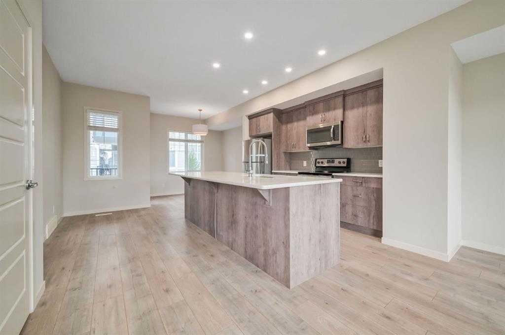 This condo is priced among the most affordable units in the complex. Welcome to this exceptional over 1,700 sq ft townhome in "The Elements of Nolan Hill" complex, offering contemporary style and a private setting backing onto single-family homes. Built in 2018, this quiet unit boasts a unique private front entrance, setting it apart from the rest of the complex. The main floor features an open-concept layout, seamlessly connecting the upgraded kitchen with sleek stone countertops and stainless steel appliances to the spacious living and dining areas. A convenient half bath on this level adds to the functionality. Upstairs, you'll find two well-sized bedrooms, a four-piece main bathroom, and a generous primary bedroom complete with its own private ensuite. Throughout the home, enjoy the durability and modern aesthetic of luxury vinyl plank flooring and stylish tile. Step outside to your exceptionally sized balcony, perfect for entertaining or relaxing, and equipped with a natural gas line for your BBQ. The lower level provides direct access to the double-wide attached garage, along with a versatile den/flex room – ideal for a home office, gym, or media space. Location is key! This home offers incredible convenience, just minutes from Costco off Sarcee Trail and a vast array of associated shopping, restaurants, and shops. Enjoy easy access to major roadways, making your commute a breeze. This home is an ideal choice for first-time buyers or those looking to step up into a modern, low-maintenance lifestyle in a vibrant Calgary community. Don't miss this opportunity!