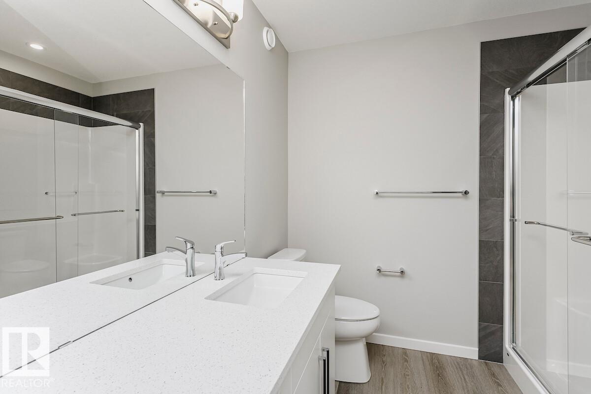 Welcome to this upgraded Bedrock Home, ideally located near parks, ponds, and walking trails. The main floor features a bedroom and full bathroom, perfect for guests. Enjoy a spacious living room with a 50" linear Ortech LED electric fireplace and a central kitchen with quartz countertops, 41" soft-close upper cabinets, stainless steel undermount sink, and a walk-through pantry with melamine shelving leading to a mudroom with built-in bench. Luxury Vinyl Plank flooring runs throughout the main floor and wet areas. A side entry and upgraded 9' basement ceilings offer excellent potential for future basement development, with oversized basement windows. Upstairs includes upgraded spindle railings and a primary bedroom with a 4-piece ensuite, dual sinks, and walk-in shower. Additional highlights include 5000K LED lighting, Smart Home technology, energy-efficient windows, high-efficiency furnace, HRV, 80-gallon hot water tank, and ductwork cleaned prior to possession. Photos are representative.