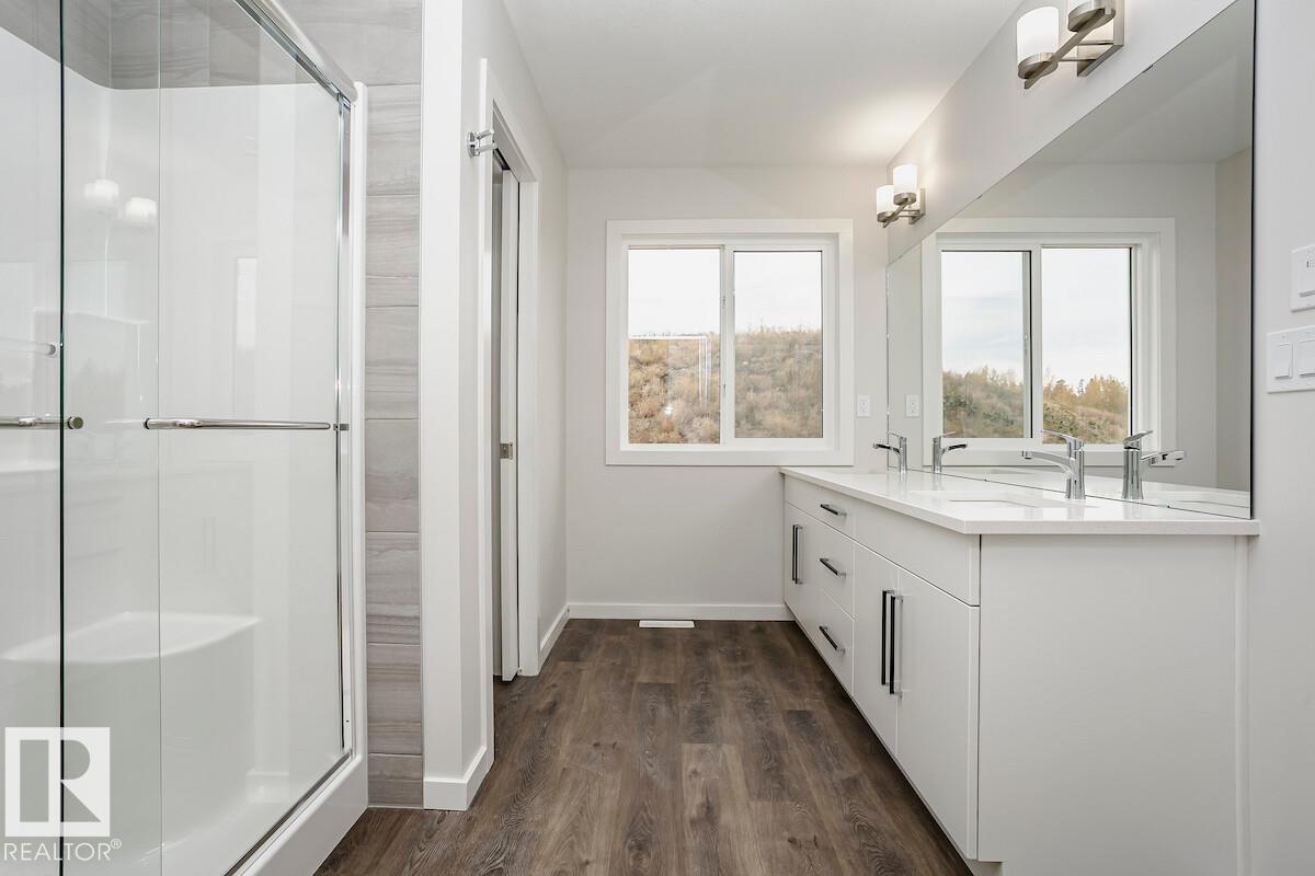 Welcome to this upgraded Bedrock Home offering modern style and efficiency. The open-concept main floor features a spacious L-shaped kitchen with 41" soft-close upper cabinets, upgraded quartz countertops, a large island, stainless steel undermount sink, and Luxury Vinyl Plank flooring. Enjoy the 50" linear Ortech LED electric fireplace and upgraded 5000K LED lighting. Upstairs offers 3 bedrooms, 2.5 baths, a bonus room, and side-by-side laundry. The primary bedroom includes a 4-piece ensuite with dual sinks and an upgraded walk-in shower. Open spindle railings add to the bright, open feel. A separate side entrance with upgraded 9’ basement ceilings allows for potential future development. Energy-efficient features include Low-E argon-filled Energy Star windows, HRV, 96.5% efficient furnace, 80-gallon hot water tank, and Bedrock’s Hotbox system. Smart home package includes Ecobee thermostat, Ring doorbell, Smart Hub, and Weiser Halo lock. Located near parks, ponds, walking trails. Photos representative.