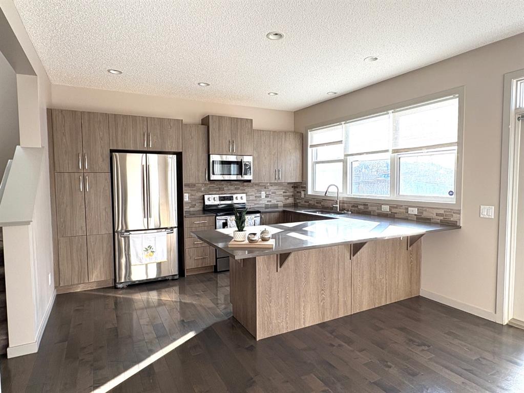 Welcome to this move-in-ready family home featuring 3 bedrooms and 3 bathrooms, with plenty of space for everyone on the top two floors. The open lower level is well laid out and ready for your ideas, complete with roughed-in plumbing for a future bathroom or wet bar. The expansive, newly fenced backyard and quiet cul-de-sac offer the perfect setting for outdoor play, summer barbecues, and privacy. With abundant windows and a southwest-facing backyard, natural light fills the home, while the well-maintained central A/C keeps it cool through the summer. Recent upgrades include brand-new shingles, siding, and gutters installed in summer 2025. The open-concept main floor features a welcoming front entry and spacious great room with beautiful antique-grey laminate flooring throughout. A designated dining area adjoins the functional kitchen, which offers a large flush-height eating bar, quartz countertops, pantry, and upgraded stainless-steel appliances including a refrigerator, smooth-top stove, built-in dishwasher, and over-the-range microwave. Upstairs, the primary suite spans the full length of the home and includes a 5-piece ensuite with a soaker tub, separate shower, and generous walk-in closet. Two additional bedrooms share a main bathroom, while the front-facing third bedroom features beautiful, oversized windows that let in an abundance of natural light. The upper level also includes a convenient laundry area and a spacious central bonus room. An insulated double attached garage with high overhead clearance provides comfort and extra storage through Calgary’s winters. Community: Evanston broke ground in 2007 and has quickly grown into one of the most desirable communities in Calgary’s northwest. Surrounded by green space and natural beauty, it’s nestled near Symons Valley and West Nose Creek, with views toward Country Hills Golf Course. With Stoney Trail bordering the south side, getting around is easy whether you’re heading downtown, to the airport, or out to the Rockies. Evanston offers the best of both worlds: a newer community with established amenities. Residents enjoy nearby parks, schools, and everyday conveniences all within minutes. Families appreciate being able to walk or drive a short distance to schools, shops, and playgrounds. Three schools currently serve the area, Kenneth D. Taylor School (K -4), Our Lady of Grace (K–9), and St. Josephine Bakhita School (K–6). Evanston Heights School (CBE, Grades 5–9) is set to open in 2026. Evanston Towne Centre offers retail, dining, fitness, and banking options, including a FreshCo grocery store and Shoppers Drug Mart pharmacy. The community features over 6.3 km of pathways connecting 16 parks and seven playgrounds. Come see why so many people love calling Evanston home.