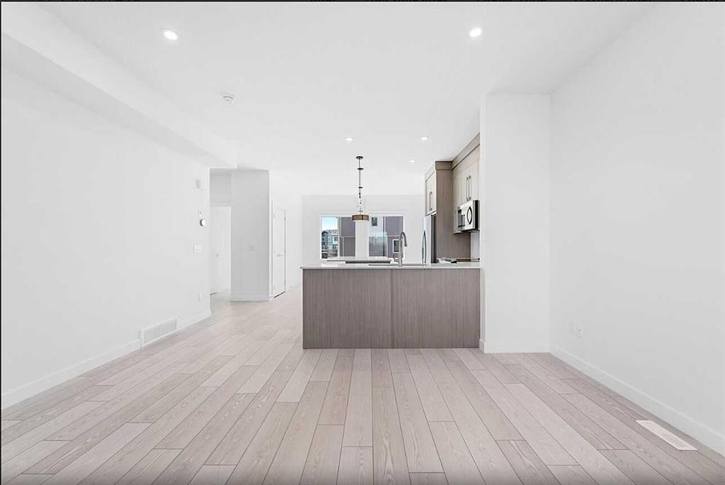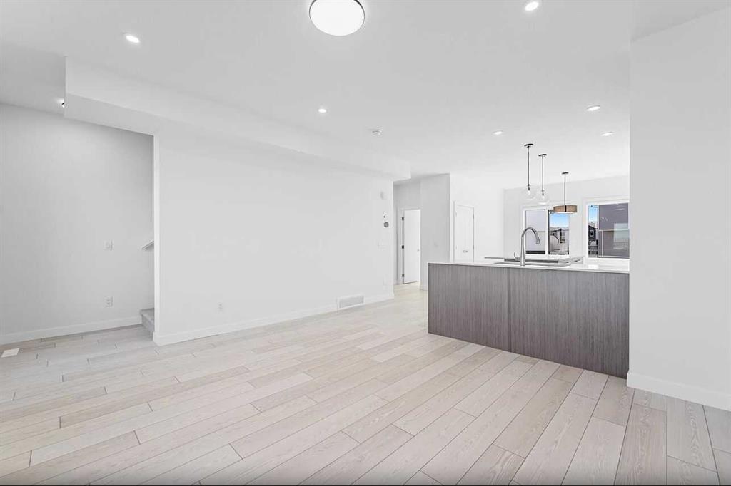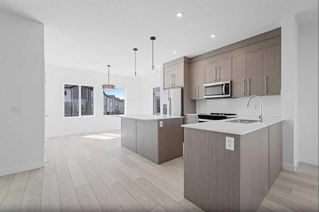 Step into elevated living with this stunning 4-bedroom townhome in the heart of Chelsea—a flourishing, family-friendly community full of energy and charm. Surrounded by scenic walking paths, playgrounds, and convenient shopping, this home perfectly blends lifestyle and location. Inside, you'll find spacious elegance and modern comfort, including 4 bedrooms, 2.5 bathrooms, and an attached double heated garage—perfect for those chilly Alberta winters. The main floor features a flexible bedroom, ideal for guests, a home office, or even a creative studio space. Every detail has been carefully crafted with premium finishes: enjoy the beauty of Vinyl Plank flooring, soaring ceilings, and designer touches throughout. The chef-inspired kitchen is a true showstopper, with full-height soft-close cabinetry, quartz countertops, a sleek stainless steel appliance package, and a handy pantry. Whether you're hosting guests at the eat-up bar or cooking weeknight dinners, this kitchen is made to impress. Upstairs, the primary suite offers a peaceful retreat with a generous walk-in closet and a luxurious 4-piece ensuite. Two more spacious bedrooms, a 4-piece main bathroom, and convenient upper-floor laundry round out the upper level—designed for everyday ease. Bright, beautifully finished, and move-in ready, this townhome is your chance to experience the sophisticated, hassle-free lifestyle that only Truman can deliver. Don't miss out—make this exceptional home yours today!