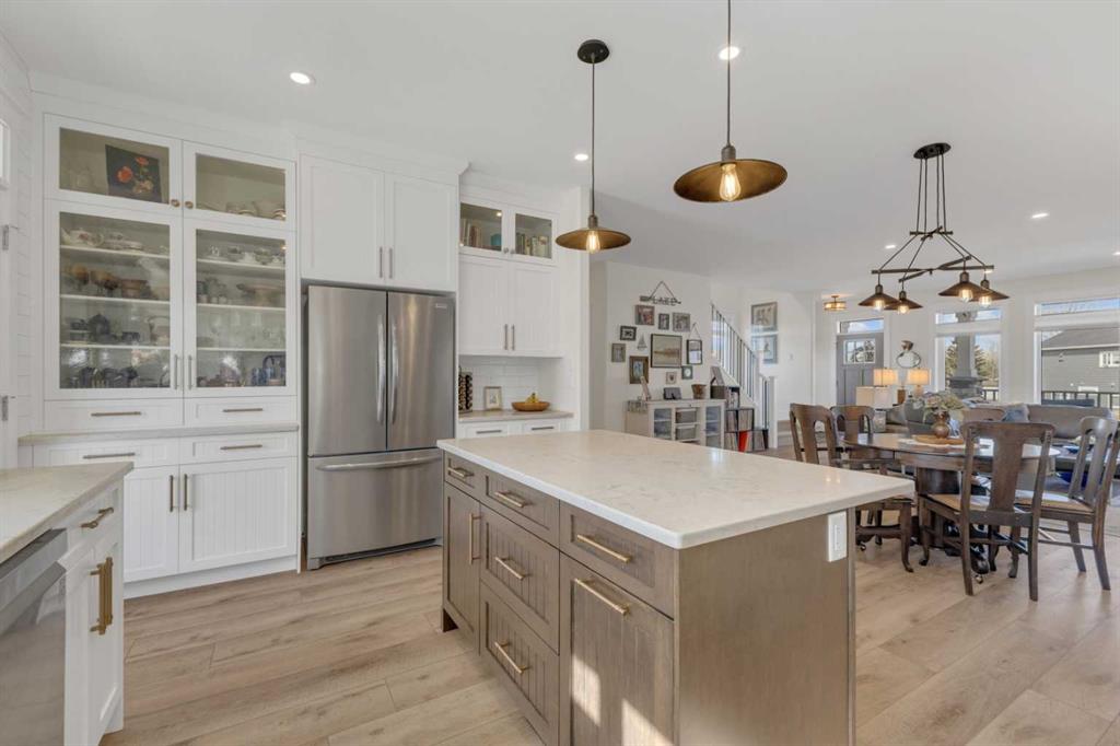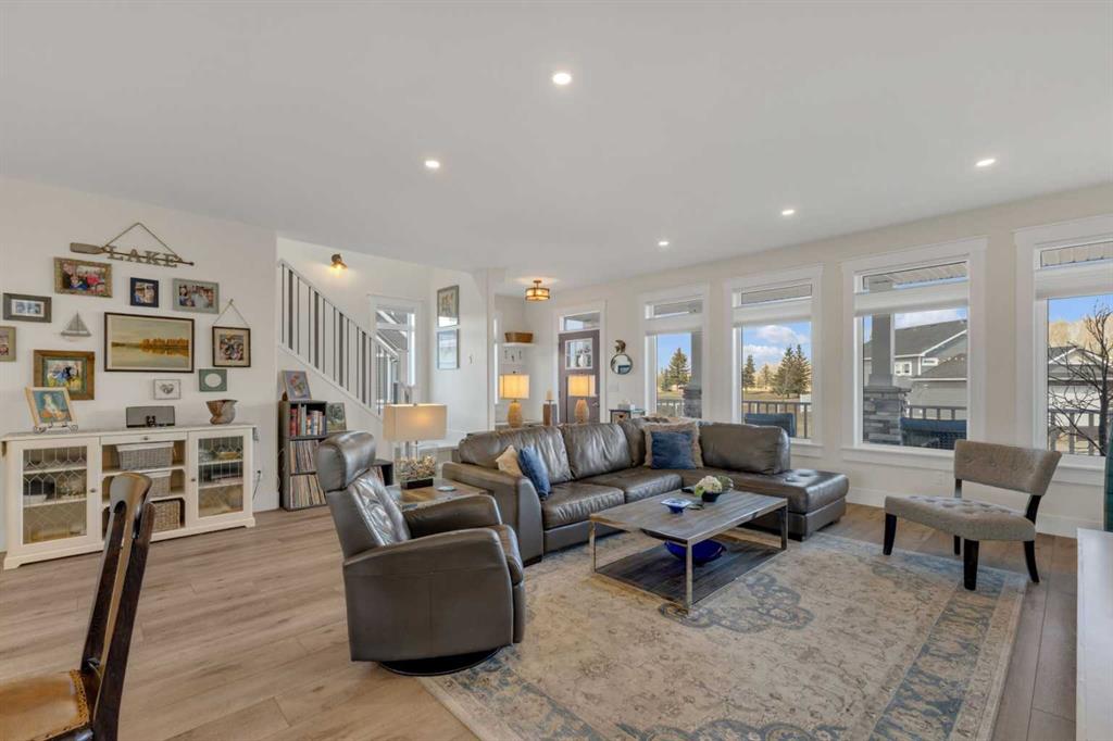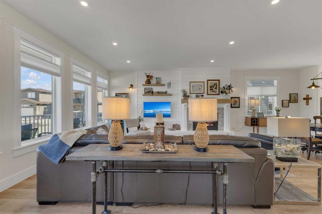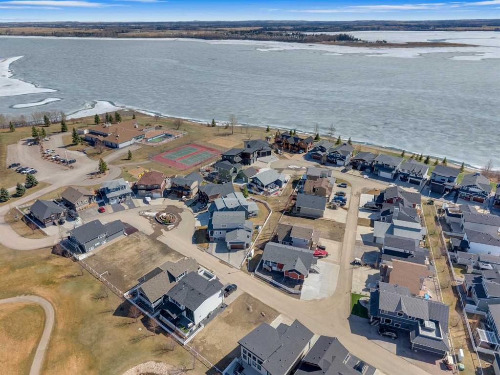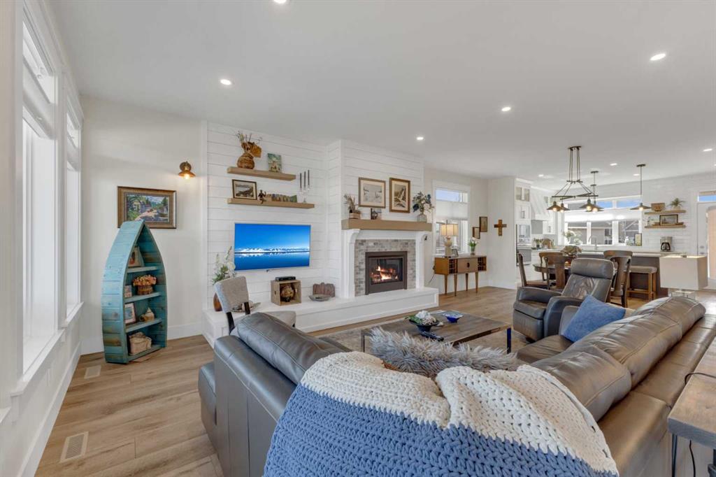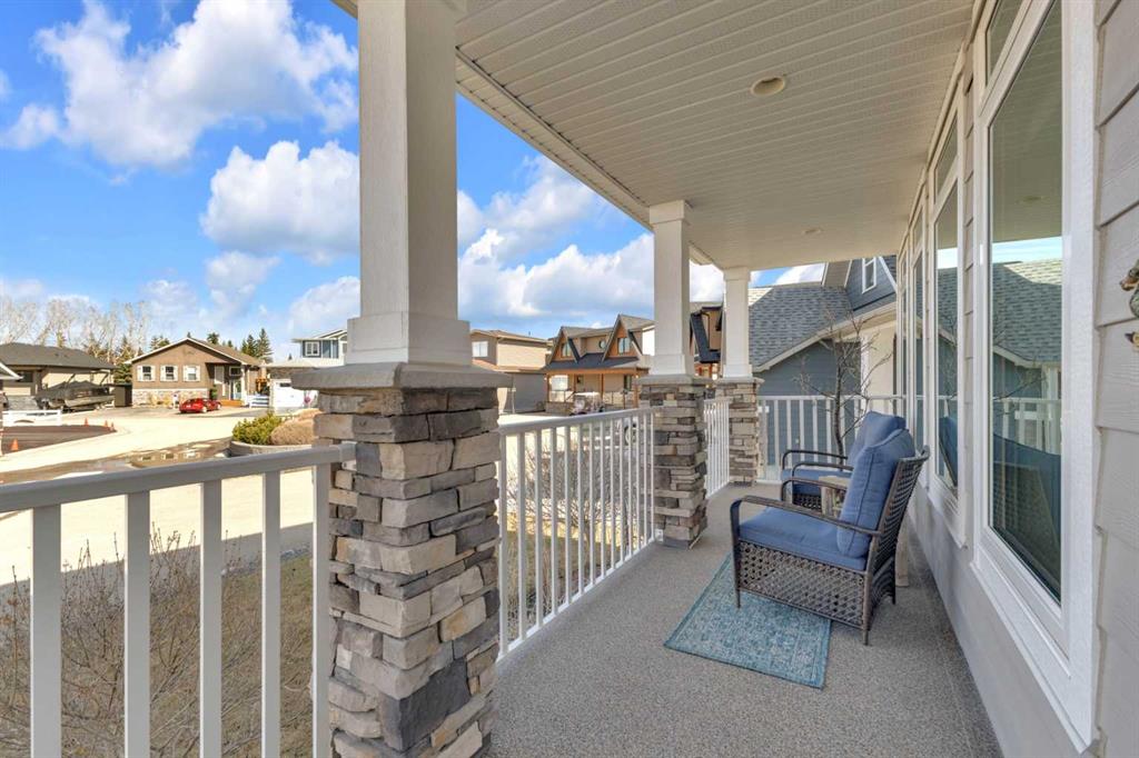 Custom-built 2-storey at Gleniffer Lake Resort offering a well-designed layout, quality finishes and thoughtful upgrades throughout. Built in 2021 with remaining new home warranty, this east-facing home is filled with natural light and provides flexible space for full-time living or a high-end recreational retreat. The main floor features an open-concept design with a bright living area anchored by a gas fireplace with full-height shiplap feature wall. The kitchen is finished with ceiling-height cabinetry, quartz countertops, full tile backsplash and a large island with seating. Additional highlights include a 5-burner gas cooktop, wall oven with built-in microwave, Blanco sink with retractable faucet, soft-close cabinetry and a central vacuum kick plate. Built-in benches at the front and back entries add everyday function. The main living area features smooth ceilings, with knockdown texture throughout the remainder of the home. Upstairs, the home offers two primary bedrooms, each with its own ensuite and walk-in closet. The main primary includes electric in-floor heat in the ensuite. In total, the home offers 5 bedrooms and 3.5 bathrooms, providing excellent flexibility for family and guests. The fully developed basement includes in-floor heating throughout and additional living space for recreation or hosting. A split furnace system with a dedicated upper-level zone and variable speed fan ensures comfort across all levels, supported by an HRV air exchange system. Outdoor living is just as well considered, with a covered rear deck featuring a gas fireplace and privacy draperies, plus a fire pit area and real grass in the front and back yards. Phantom screens on both front and rear doors allow for easy indoor-outdoor flow. The heated garage offers 12’ ceilings and approximately 550 sq ft of space, accommodating two vehicles and additional storage. A detached shed, designed to complement the home, provides even more storage options. The lot is positioned to allow parking for up to four vehicles. Additional features include upgraded luxury vinyl plank flooring, high-quality carpet with 10 lb underlay, LED pot lighting, wall sconces, central vacuum system and custom closet shelving. Located in Gleniffer Lake Resort & Country Club, this property offers access to golf, lake activities, trails and a strong sense of community, with the flexibility to enjoy it as either a full-time residence or a recreational retreat.