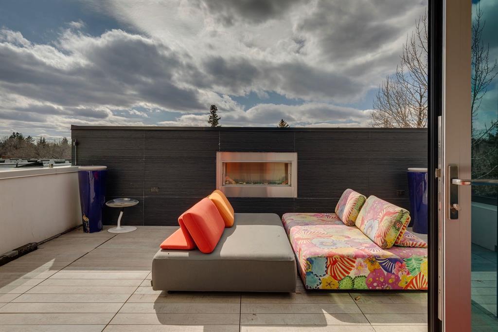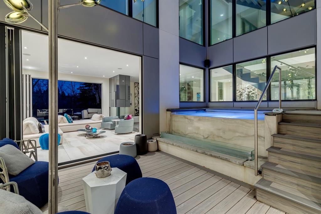 Experience unparalleled modern luxury on one of Elbow Park’s most coveted stretches of Rideau Road. This architecturally striking residence blends cutting edge design with a serene, nature inspired setting, backing onto the Elbow River and separated by a treed island creating a private oasis that feels worlds away from the city. A stunning facade of stucco and marble, paired with sleek glass railings, sets the tone for the refined elegance within. Inside, soaring ceilings and expansive windows flood the home with natural light, while marble tile flows seamlessly throughout the main and upper levels. The grand foyer offers a breathtaking introduction, framing views of the home’s central courtyard retreat. Designed with entertaining in mind, the open concept dining space connects effortlessly to a show stopping kitchen. A custom movable island reveals an integrated cooktop and prep sink, while premium appliances, including built-in oven, microwave, coffee station, Subzero panelled refrigerator, and beverage drawers ensure both function and style. Sleek cabinetry can be closed off entirely for a clean, minimalist aesthetic, complemented by a fully equipped butler’s pantry. The living room is a masterpiece of indoor/outdoor flow, with patio doors opening to an expansive rear deck. A sophisticated gas fireplace with concealed television anchors the space, while a raised platform adds versatility for lounging or entertaining. A custom wine cellar provides the perfect showcase for your collection. Guests will love the main floor bedroom complete with walk-in closet and private ensuite. At the heart of the home lies a spectacular private courtyard. Nano doors on both sides create seamless integration, while an infinity hot tub and statement lighting evoke a true spa-like retreat. Upstairs, a thoughtfully designed laundry room features double washers and dryers, ample storage, and utility sink. Five spacious bedrooms include a remarkable primary retreat, complete with a boutique style dressing room and tranquil sleeping quarters wrapped in windows. The luxurious ensuite offers a steam shower, sculptural concrete soaker tub, dual vanities, and dedicated vanity station. The third level elevates the lifestyle further with a loft lounge, wet bar, wine room, home gym, and a rooftop patio showcasing breathtaking downtown skyline views and an outdoor fireplace. The fully developed lower level features in-floor heated concrete floors, a theatre room with custom LED ceiling and projector, and a large mudroom leading to an extraordinary six car heated garage with a heated driveway. Smart home integration via Control4, carbon fibre fixtures, and extensive built-ins highlight modern innovation. Outdoors, multiple patios with glass railings provide ideal entertaining spaces, while a tranquil lower patio offers peaceful riverfront relaxation where you can hear birds sing while ducks float by. This exceptional residence delivers a rare blend of luxury, design, and natural beauty.