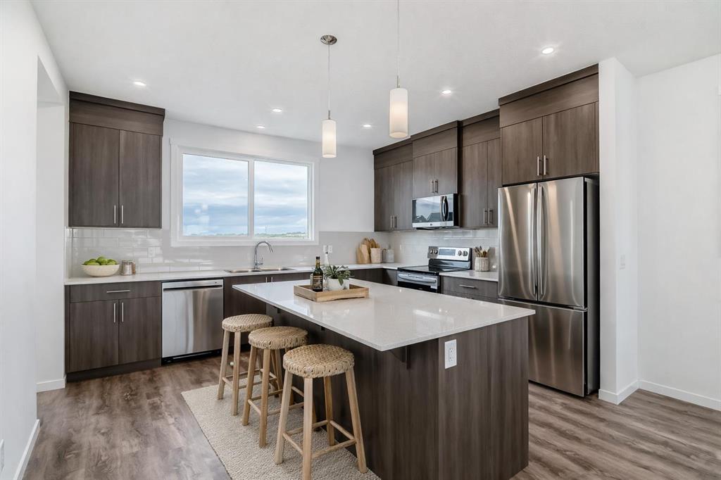 Discover your dream home in Wedderburn, Okotoks, just 25 minutes from Calgary via Highway 2A—a 1,448 sq. ft. gem by Anthem, perfect for buyers seeking a turnkey haven with a builder’s new home warranty. The open-concept main floor dazzles with sunlight through an extra dining window, durable LVP flooring, and a seamless living-dining space for cozy nights or gatherings. The upgraded kitchen shines with ceiling-height soft-closing cabinetry for ample storage, sleek stainless steel appliances, quartz countertops, a spacious island, under-cabinet lighting, and a walk-in pantry. Upstairs, your primary bedroom boasts a walk-in closet and 3-piece ensuite, plus two bedrooms with walk-in closets, a full bath, and a stackable washer/dryer. A side entrance and 9’ basement with two windows offer future suite potential (subject to approval and permitting by the city/municipality), while a BBQ gas line in back awaits summer evenings. Minutes from St. James School, Wedderburn Park, D’Arcy Crossing shops, and commuter routes, this energy-efficient home blends tranquility and convenience. Stop dreaming and book your private showing today to embrace the Wedderburn lifestyle!