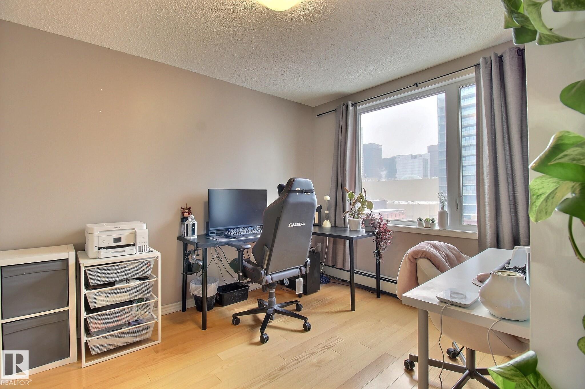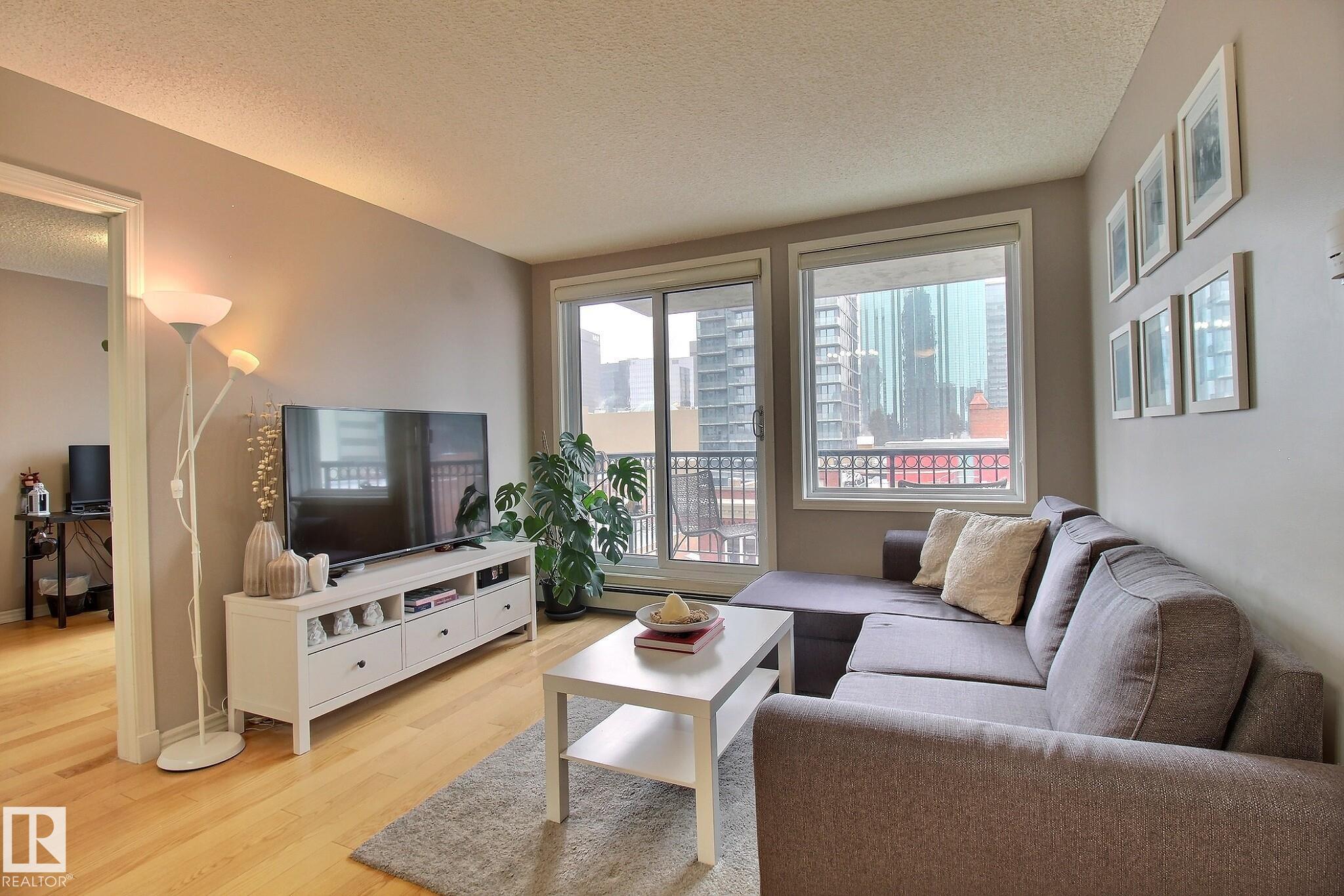 Downtown Living at its Finest on Vibrant 104 Street! This 2 Bedroom, 1 Bathroom unit offering 775 Sq Ft with Titled Heated Parking in the Secure Parkade and In-Suite Laundry with additional storage is ready to call home! Featuring Hardwood Floors, Maple Cabinetry and Stainless Steel Appliances, the open concept layout is filled with natural sunlight from oversized windows. The Primary Bedroom offers a Walk Through Closet with direct access to the Bathroom. The Second Bedroom includes a Walk In Closet plus additional Storage. Enjoy East Facing Downtown Views from your private Balcony with a Gas Line for a BBQ or Firepit. This well managed and secure building offers a Fully Equipped Fitness Facility. Steps to Grocery Stores, Shopping, Coffee Shops, the 104 Street Farmers Market, the Ice District and LRT access to the University of Alberta and MacEwan. Unbeatable Walkability in the Heart of Downtown, an Exceptional Opportunity in a Prime Location perfect for Students, Professionals or Investors.