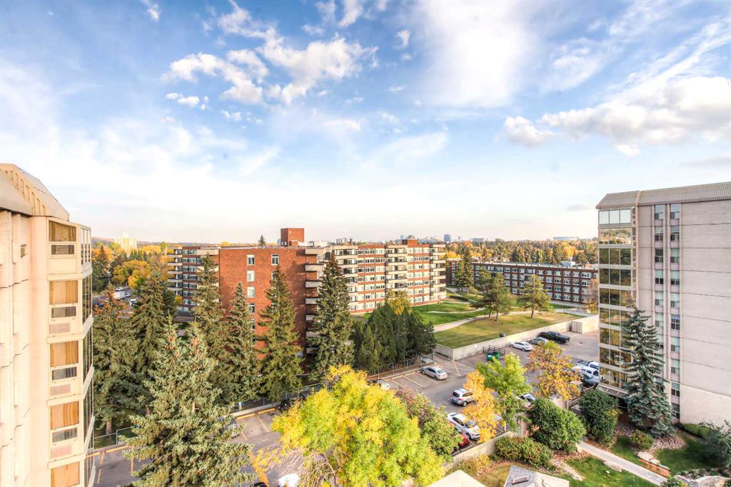 Penthouse condominium home in the lovely Varsity Towers. This top floor unit provides a beautiful living space and expansive distant views to the south and west that include the mountains, an overlook of Varsity, and the river valley. Excellent floor plan that provides an open plan and comfortable divided spaces. A Large kitchen with granite counters and quality built-in appliances connects to a very lovely sunroom with views to the south and west. The generous living room is warmed by a gas fireplace. Apart from the living spaces, a hallway leads to 2 large bedrooms and an office (easy conversion to 3rd bedroom if desired). The primary bedroom has a gas fireplace, a balcony to the outside deck space, a walk-in closet and a large 5pc ensuite bath. Separate laundry room in hallway next to the 4pc main bathroom. The home is excellent! Now amenities: Roof top patio (stairway directly outside the unit door) for enjoying the view, sunning, or a bbq., a beautiful indoor pool, exceptional private garden spaces, a well equipped gym, theatre/games room, library/study room, warm lobby spaces, car wash. In addition, this home comes with 2 indoor parking spaces and its own storage room. This home and the property together offers excellent value by ft$ while providing a great lifestyle.