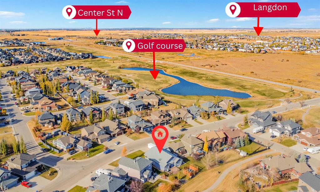 Welcome to Boulder Creek Estates, where small town charm meets elegant living. This immaculate, fully finished 1,800 sq ft bungalow with a triple car garage offers over 3,000 sq ft of beautifully designed living space and an ideal blend of comfort, functionality, and sophistication. Inside, soaring vaulted ceilings create an open, airy feel throughout the main floor. The spacious formal dining room sets the stage for memorable family gatherings, while the large den offers a perfect space for a home office or quiet retreat. The chef-inspired kitchen features stainless steel appliances, gas stove, new refrigerator, granite countertops, abundant cabinetry, and a large skylight that floods the space with natural light. The cozy living room is anchored by a gas fireplace, creating a warm and inviting atmosphere. The primary suite is a true sanctuary with a stylish barn door leading to a luxurious 5 pc ensuite featuring dual sinks, a soaker tub, and a separate shower. The fully developed lower level is equally impressive, featuring a spacious recreation room with a second gas fireplace, two additional bedrooms, and large windows that bring in plenty of natural light. A huge storage area and two laundry rooms (one on each level) add everyday convenience. The home includes central air conditioning for enhanced comfort. Outside, the fully landscaped backyard with underground sprinklers backs onto a tranquil green space and sits on a desirable reverse pie lot, providing extra privacy and a beautiful outdoor retreat. The triple garage offers ample parking and storage for vehicles, tools, and toys alike. Located in the heart of Langdon, Boulder Creek Estates is a vibrant golf course community just minutes from Calgary. Enjoy nearby amenities including the Boulder Creek Golf Course, Langdon Fieldhouse, skatepark, playgrounds, schools, and local shops and restaurants. Families will love the strong sense of community, scenic walking paths, and easy access to major routes for commuting. Offering exceptional craftsmanship, thoughtful upgrades, and a prime location, this stunning bungalow delivers the perfect balance of space, style, and suburban tranquility.