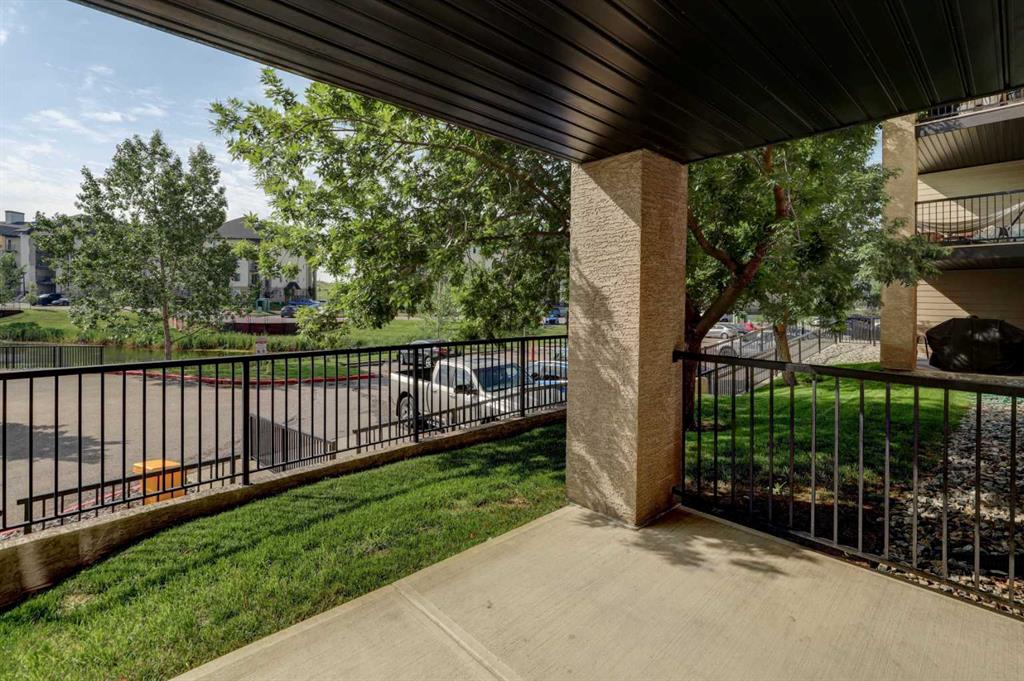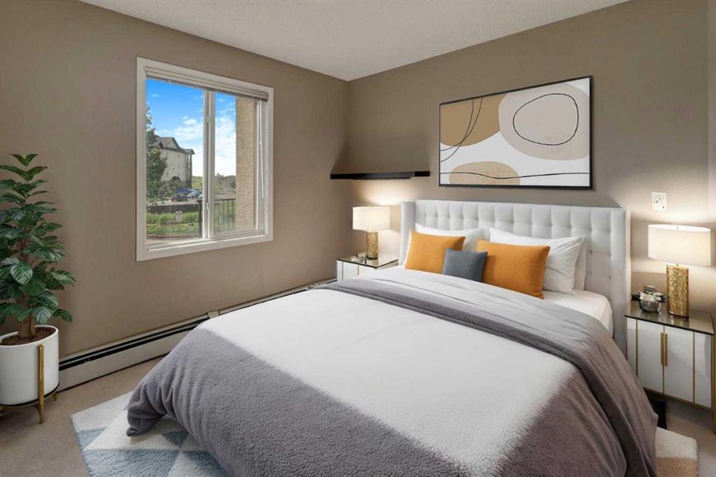 Welcome to this bright and spacious main-floor condo in the heart of Downtown Airdrie! This 2-bedroom, 2-bath home offers an open-concept layout with a functional kitchen featuring an eat-up breakfast bar that flows seamlessly into the dining and living areas — all filled with natural light from large windows. The primary suite includes a 4-piece ensuite and walk-in closet, while the second bedroom is generously sized — perfect for guests, a roommate, or a home office. Step outside to your private ground-level patio overlooking the pond, ideal for morning coffee or evening relaxation. Additional highlights include in-suite laundry with plenty of storage and two assigned parking stalls. Located within walking distance to shops, restaurants, and local amenities, this home is an excellent opportunity for first-time buyers or investors alike. Be sure to view the VIRTUAL TOUR LINK for interactive floor plans, high-definition photos, and a room-by-room virtual walkthrough!