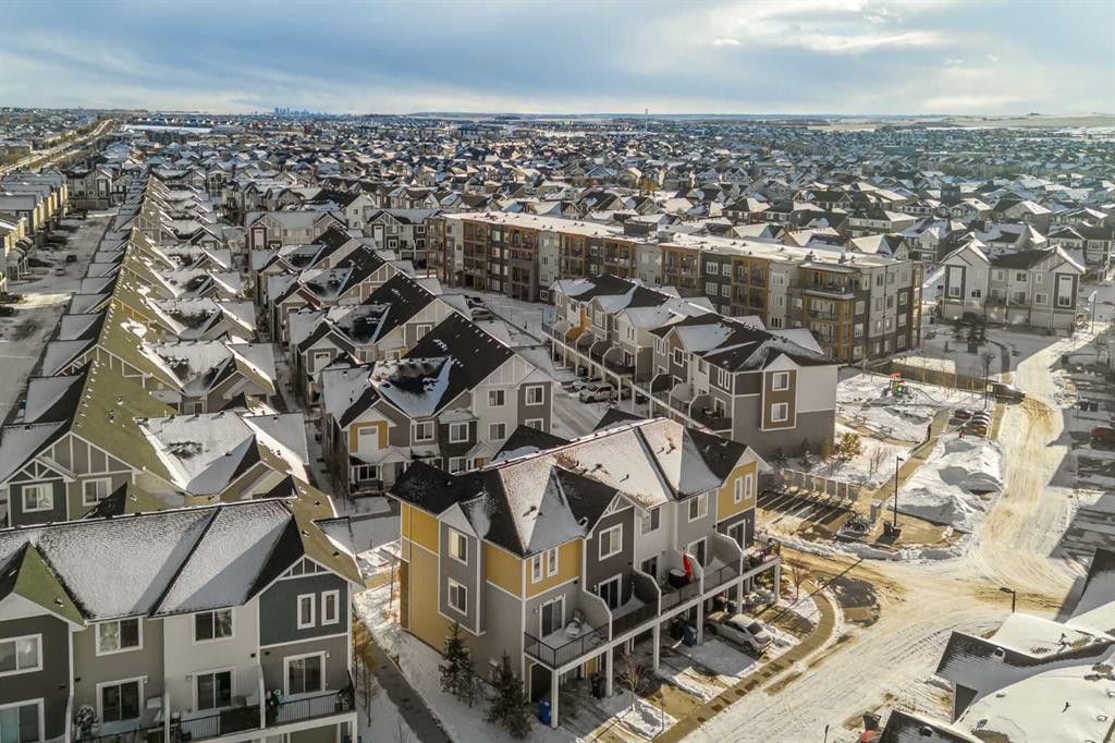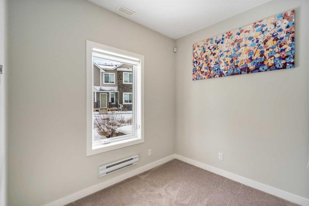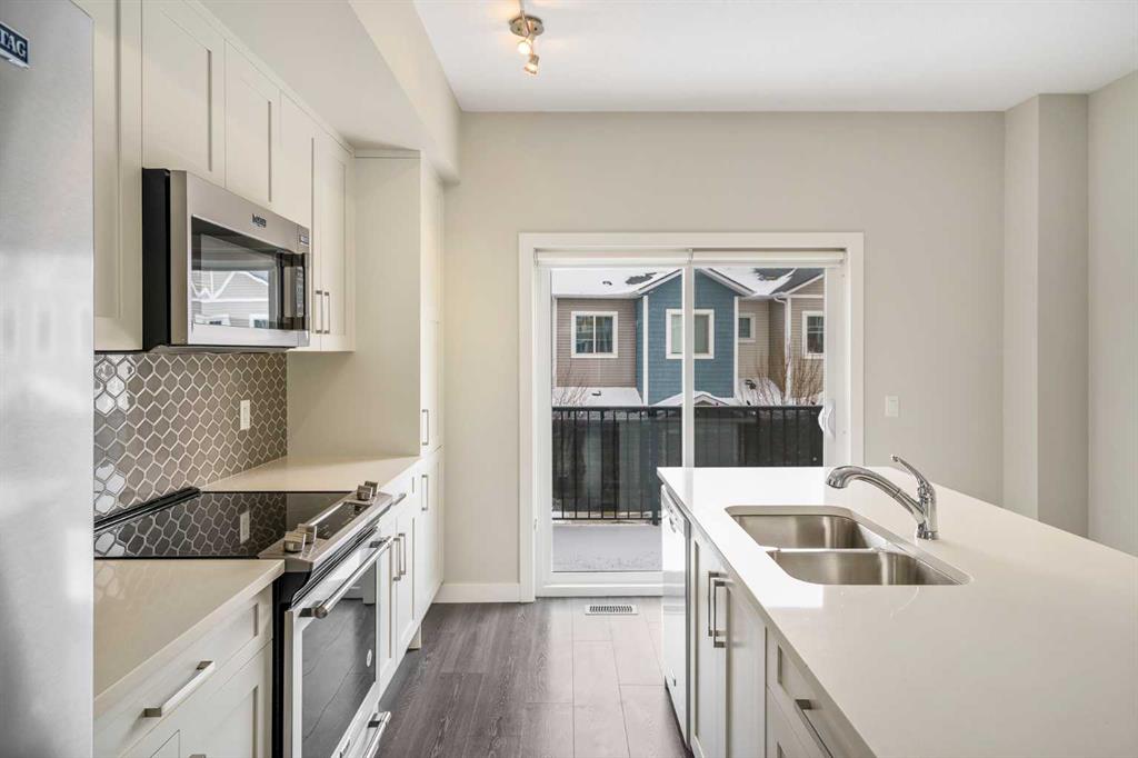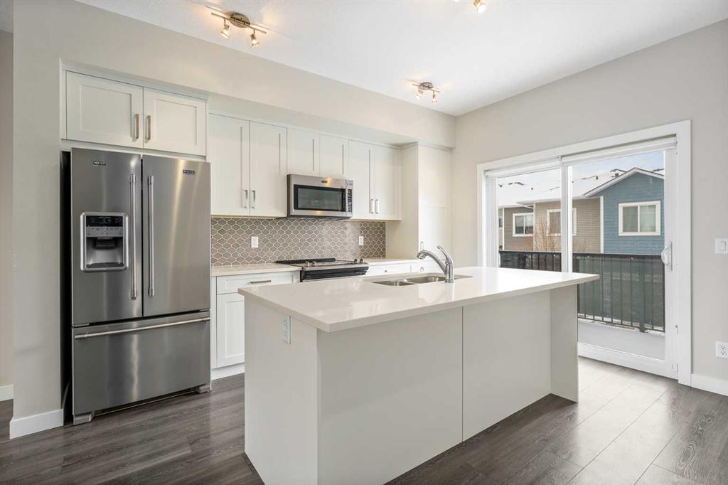 Welcome to this beautifully maintained 2-bedroom, 2.5-bathroom townhouse in the family-friendly community of Canals in Airdrie. This home offers AIR CONDITIONING, stylish upgrades, a bright and spacious white kitchen, and an oversized single attached garage. Alarm-monitored security system with features such as motion detectors, cameras, and smart doorbells will enhance your safety. Located in one of Airdrie’s most desirable communities, the Canals is known for its scenic walking and biking paths while still providing easy access to nearby shops, restaurants, schools, and everyday amenities. Upon entry, you’re welcomed by a spacious foyer, a convenient powder room, and a versatile flex space that can be used as a home office, gym, or additional living area. The main floor features a bright open-concept layout with 9-foot ceilings, creating an inviting atmosphere. The modern kitchen showcases an upgraded Maytag appliance package, quartz countertops, an under-mount sink, soft-close cabinetry, and a large centre island perfect for cooking and entertaining. Just off the kitchen is a spacious balcony with a gas line for BBQing. The generous dining and living areas provide plenty of room to relax or host guests. Upstairs, the primary bedroom features a 4-piece ensuite and generous closet space. A second spacious bedroom, another full 4-piece bathroom, and upper-level laundry adds to daily convenience. Located close to schools, shopping, and restaurants, with the added bonus of the nearby canal pathways creating a beautiful setting year-round. Whether you’re looking for your first home, an investment property, or a low-maintenance lifestyle, this townhome offers comfortable canal-side living in the heart of Airdrie.