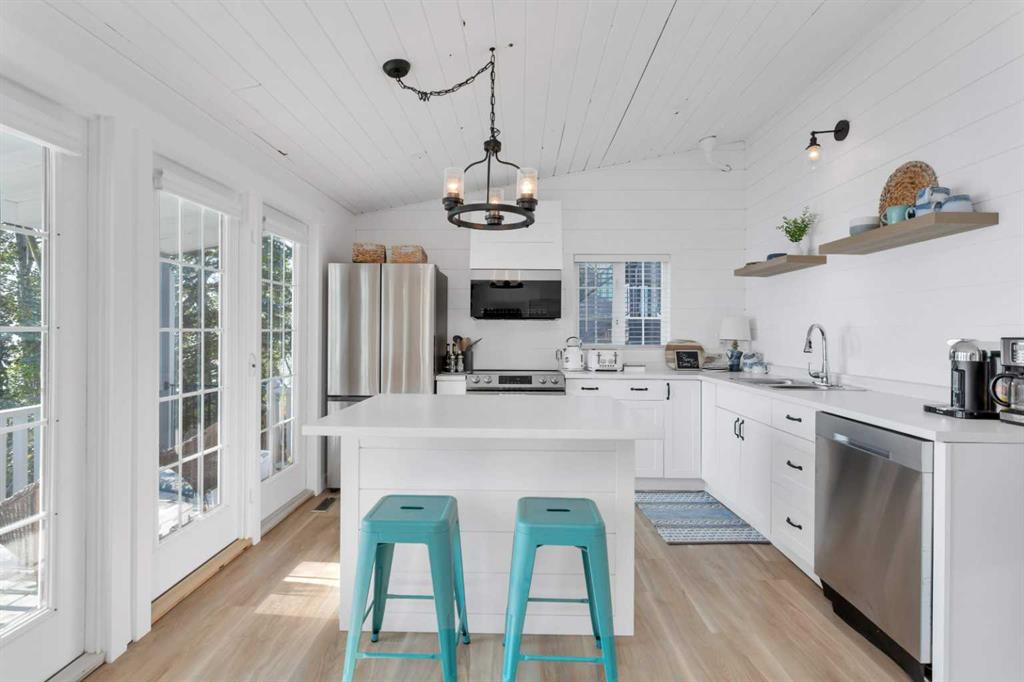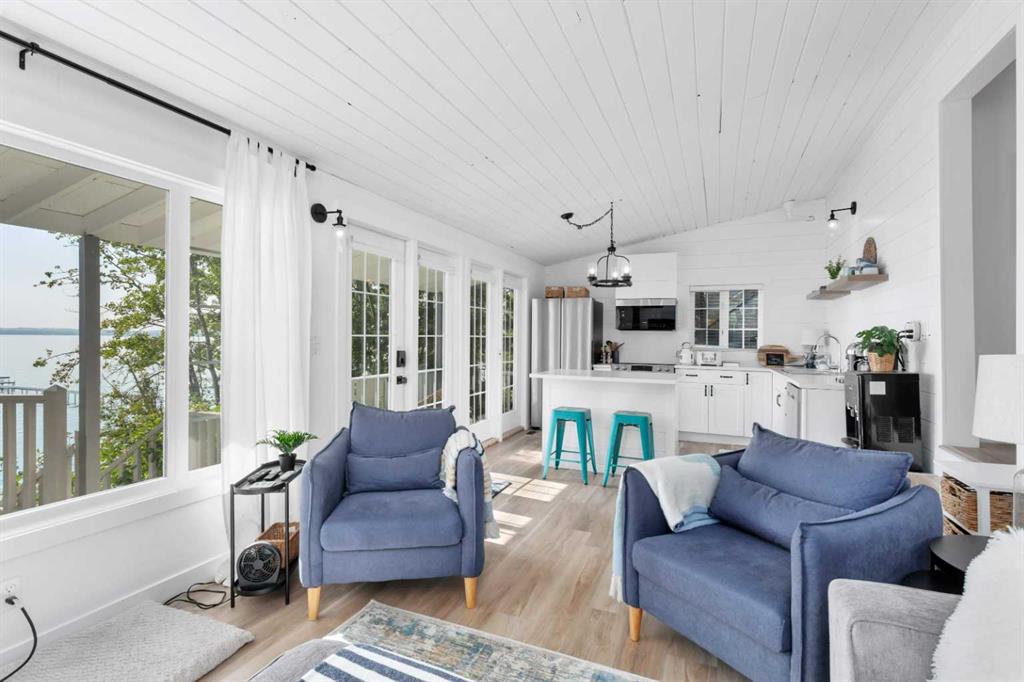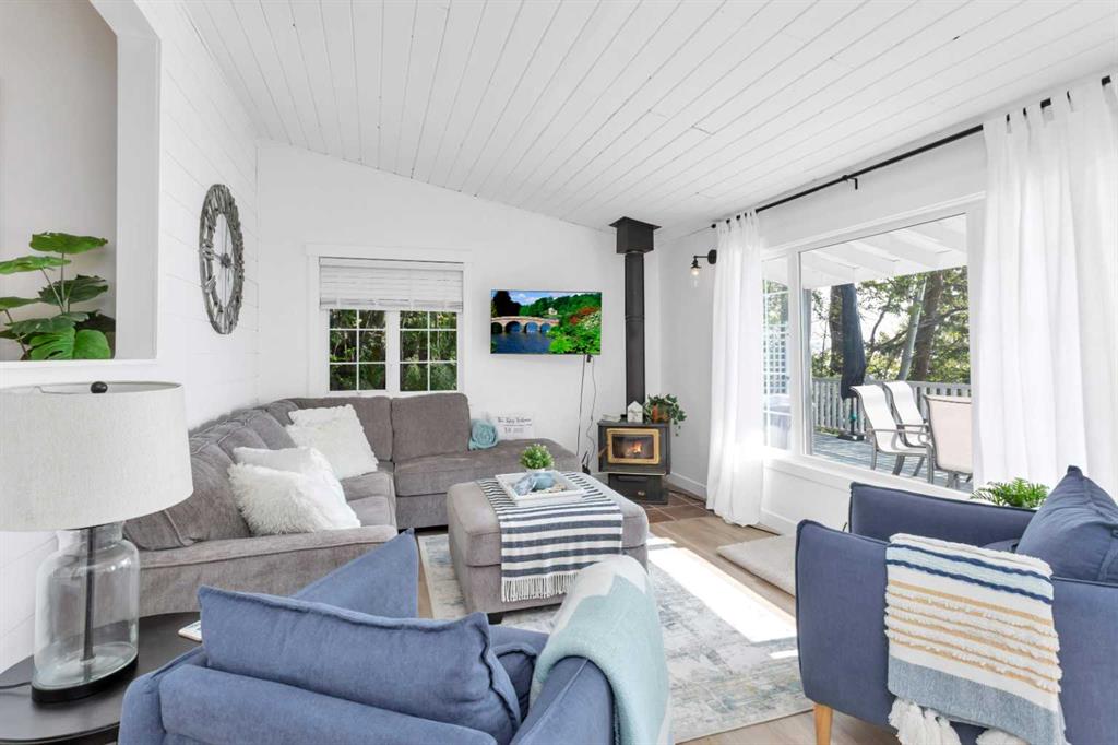 Welcome to your dream lakefront getaway! Nestled on the sunny side of Sylvan Lake, this beautifully renovated cabin sits on a level 50x203’ lot with 50 feet of pristine shoreline and stunning southwest-facing views. With full riparian rights and some of the best sunset views on the lake, this is a rare opportunity to enjoy both privacy and prime water access year-round. The cozy yet spacious 1,044 sqft cabin features 3 bedrooms and 1 full bath, all recently updated with stylish finishes. Step inside and fall in love with the warmth of the wood panel ceilings, corner wood-burning fireplace, and the perfect blend of rustic charm and modern convenience. Recent upgrades include a brand new kitchen, new flooring, updated lighting, and a refreshed bathroom with new shower, vanity, and toilet. The home is also equipped with new appliances (fridge, stove, dishwasher, washer, and dryer), on-demand hot water, a new furnace, new shingles, and eavestroughs — making it fully move-in ready and fully winterized for year-round enjoyment. Modern touches include the ability to charge an electric vehicle, perfect for today’s environmentally conscious homeowner. Outside, the home continues to impress with extensive landscaping, RV parking pad and a large deck perfect for morning coffees or evening wine overlooking the lake. Whether you're swimming, boating, or relaxing by the fire, this property delivers the ultimate lake life experience.