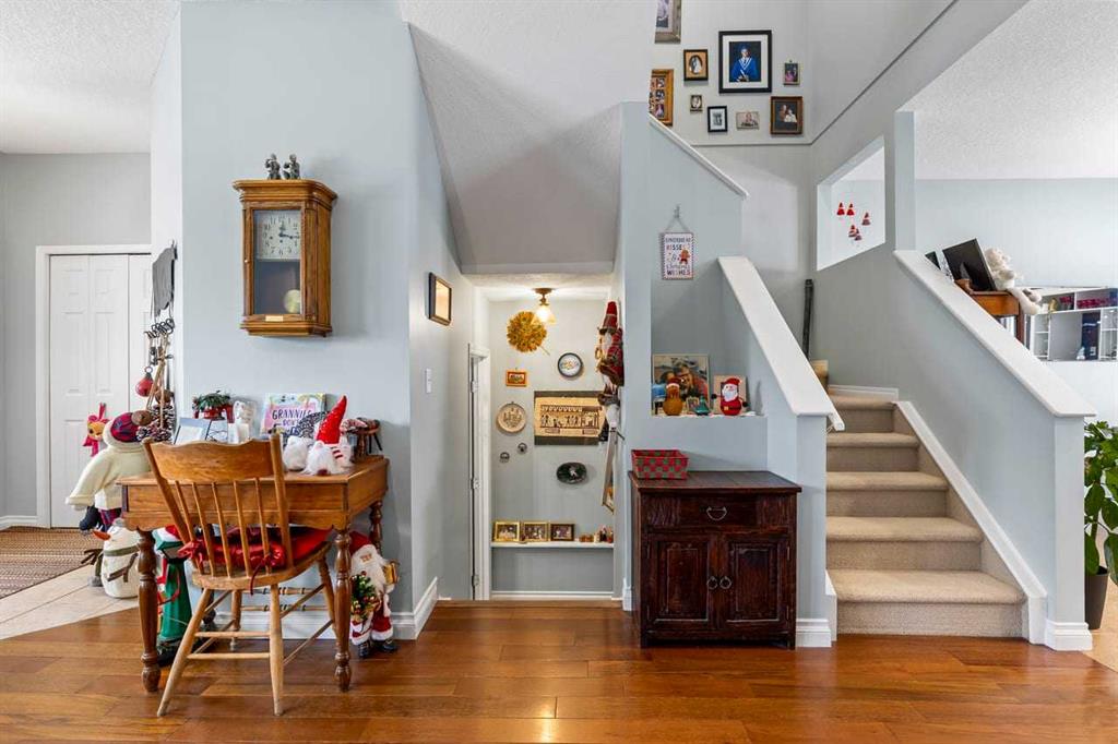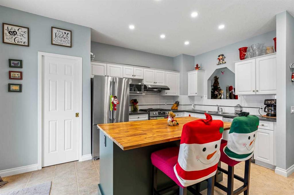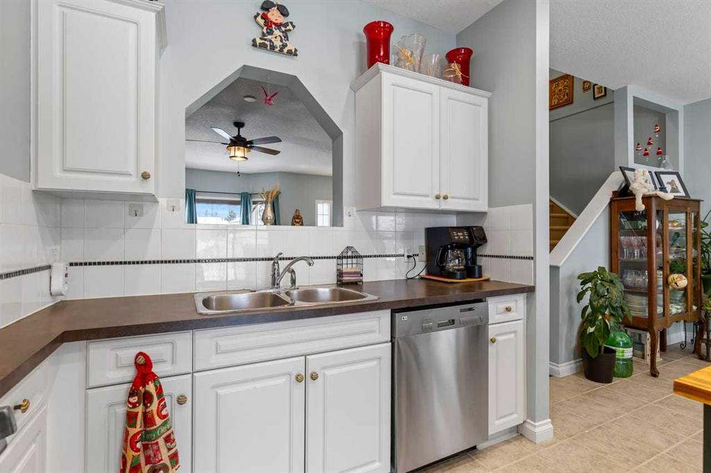 Welcome to this inviting Citadel home featuring a BRIGHT WALKOUT BASEMENT, a DOUBLE GARAGE, and the comfort of CENTRAL AIR CONDITIONING—perfect for year-round living. Offering more than 1500 sq. ft. of thoughtfully designed space, the main floor opens with a welcoming foyer flowing into the living room finished with beautiful MAIN FLOOR HARDWOODS, while the bright kitchen and dining area and a breakfast bar featuring CERAMIC TILE FLOORS and are filled with natural light. Crisp white cabinetry and stainless steel appliances including a HIGH-END GAS RANGE create a clean modern feel, centered around the cozy living area fireplace ideal for family gatherings and relaxed evenings. Upstairs, the spacious primary bedroom offers a peaceful escape complete with a sparkling ensuite featuring a glass shower and soaker tub—perfect for unwinding under the stars. Two additional bedrooms provide comfortable space for family or guests. The DEVELOPED WALKOUT BASEMENT offers versatility for a studio, office, gym or media room with direct access to the yard. Fire up the BBQ on the upper deck as the kids play below on the low-maintenance synthetic lawn and enjoy your above ground vegetable garden. All of this is located close to parks, pathways, schools and multiple shopping options—an ideal blend of convenience and community. Water tank, furnace & A/C all new in 2023 , shingles are 10 years old and the condo board is replacing all windows and the patio door in spring 2026.