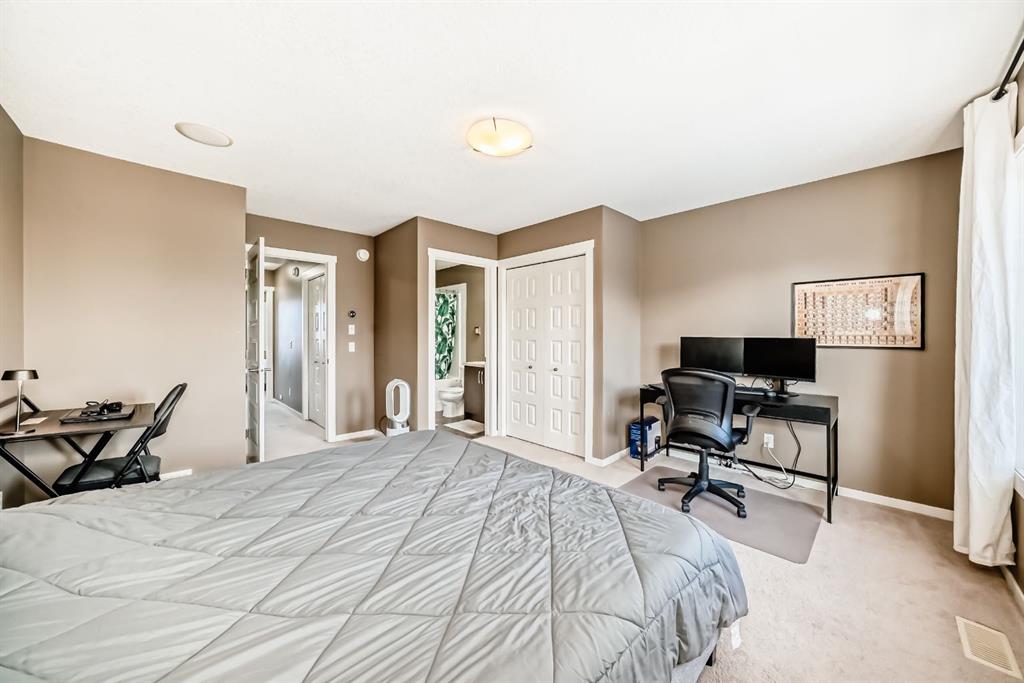 Welcome to this well-maintained townhouse in the desirable lake community of Auburn Bay, offering over 1,200 sq ft of living space. Featuring 2 bedrooms, each with its own ensuite, this home is ideal for first-time buyers or investors. The main level includes luxury vinyl plank flooring, an open living and dining area, a powder room, and built-in speakers. The kitchen offers ceiling-height cabinets, quartz countertops, and a tile backsplash. Upstairs features two spacious bedrooms with plush carpeting, including a primary bedroom with 5-piece ensuite and a second bedroom with 4-piece ensuite and double closet. Upper-level laundry and attic storage add convenience. Enjoy a west-facing fenced yard and year-round lake access. Close to South Health Campus, Seton Shopping Centre, schools, parks, transit, and more.