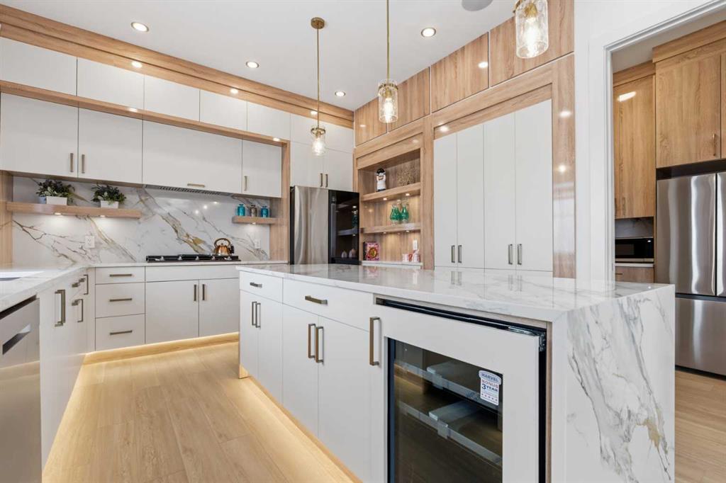 OPEN HOUSE SATURDAY, APRIL 11TH FROM NOON - 2 PM. Backing onto greenspace with direct access to biking and walking trails, this expansive custom built 5+3 bedroom home with a FULLY DEVELOPED WALK OUT BASEMENT offers over 4,600 sq ft of beautifully designed living space. The main level features luxury vinyl plank flooring, soaring ceilings, and stylish lighting throughout. A dramatic front living room with a towering ceiling flows into a welcoming family room, highlighted by a floor to ceiling feature wall with fireplace. This open concept continues into the spacious dining area and the stunning kitchen, complete with a waterfall island/eating bar, abundant cabinetry, a high end appliance package, and a fully equipped spice kitchen/butler’s pantry. A generous main floor bedroom with its own private 3 piece ensuite is ideal for guests or multi generational living. An office tucked quietly down the hall provides an excellent work from home space, and a 2 piece powder room completes the level. Upstairs, a central bonus room anchors the second floor, which hosts four additional bedrooms—two with private ensuites—along with a 3 piece Jack & Jill bath and a convenient laundry room. The primary retreat impresses with a dramatic tray ceiling, a walk in closet, and a luxurious 5 piece ensuite featuring dual sinks, a relaxing soaker tub, and a separate shower. The walk out basement is perfectly suited for extended family living, offering its own spacious living room with a floor to ceiling feature fireplace and built ins, a dining area, and a well appointed kitchen with quartz countertops, an eating bar, ample cabinetry, and stainless steel appliances. Three sizeable bedrooms (including one with a 4 piece ensuite), a 4 piece main bath, and private laundry facilities complete this level. Additional highlights include central air conditioning, Smart Home features, and built in speakers. Outdoors, enjoy a back deck overlooking the greenspace, a covered patio, and effortless parking with a triple attached garage. This exceptional property is close to schools, shopping, parks, and public transit, with quick access to Country Hills Blvd and Stoney Trail—offering convenience, space, and a rare connection to nature.