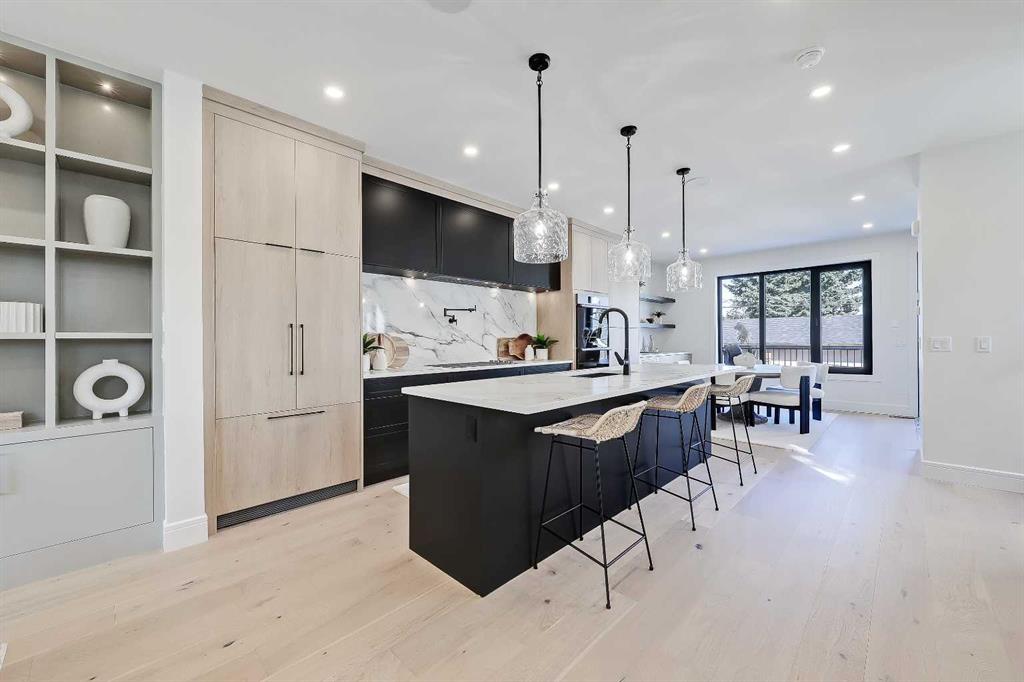 Tile detailing, modern finishes, designer lighting package, upgraded German-made KULU windows & doors…it’s everything you’re looking for in a luxury 3-STOREY SEMI-DETACHED INFILL! This designer home is located just off 26th Ave in the heart of Killarney – the ideal location for your new family home! The main floor opens into a welcoming foyer w/ built-in closet & bench, offering views into the spacious living room w/ a gas fireplace w/ full-height tile, as well as a stunning wood-panelled feature wall. Beautiful oak hardwood flooring leads you into the open-concept kitchen – fully equipped w/ an oversized island w/ quartz countertop, timeless shaker-style cabinetry w/ numerous lower drawers, & a contemporary flat-panel built-in cabinetry pantry. The designer kitchen is nicely finished w/ a full stainless steel appliance package, complete w/ a panelled French door refrigerator, a Dacor double wall oven, a gas cooktop w/ pot filler, & a built-in dishwasher. The custom built-ins continue into the dedicated dining room, w/ open shelving & lower cabinets w/ quartz counter for everyday convenience. Step out onto the back deck through the rear mudroom, complete w/ a built-in bench, coat cabinet, & tile flooring. Before you head upstairs, the stylish powder room is tucked away w/ a beautiful skirted vanity & vessel sink. Up the bright stairwell w/ glass wall awaits the primary suite – as sleek & modern as the rest of the home, w/ oversized windows, a private balcony w/ KULU door, & an extra-large walk-in closet! The chic ensuite features a dual vanity w/ a quartz countertop & a bank of lower drawers, a freestanding soaker tub, & a stand-up shower w/ full glass walls, rain showerhead, & bench. Two secondary bedrooms share the main 4-pc bath & the laundry room features a sink, upper cabinetry, hanging rod, tile backsplash, & a folding counter. A luxury home isn’t complete without a THIRD FLOOR LOFT, & this space has not been overlooked. More oversized windows bring in lots of natural light, shining across a spacious rec area w/ gas fireplace, full wet bar w/ extended quartz countertop, bar sink, & statement open shelving. A lovely sitting area w/ built-in desk overlooks the COVERED BALCONY & of course, there’s a full bath w/ fully tiled shower, too. The living space continues into the basement, w/ a full wet bar w/ quartz island, dual basin sink, & a designer tile floor, w/ a large family room, built-in media centre, a glass walled home gym w/ sports flooring, a 4th bedroom, & a full 4-pc bath. Killarney offers the perfect balance of community & convenience. From here, you’re within walking distance to Glendale School, Killarney School, & Bishop Carroll High. Westbrook Mall & the CTrain are only 5 minutes away, making downtown access effortless. The Killarney Aquatic & Recreation Centre, Optimist Athletic Park, & Shaganappi Golf Course are all nearby. *Home not started please visit show suite at 2838 34 Street SW*
