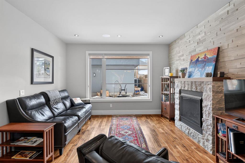 This beautifully finished contemporary duplex showcases exceptional quality, craftsmanship, and thoughtful design throughout. The open-concept main level is flooded with natural light from oversized windows, creating a bright and inviting atmosphere perfect for both everyday living and entertaining. At the heart of the home, the centrally located kitchen is designed to bring people together. It features full-height maple cabinetry, sleek countertops, and commercial-grade appliances—blending style and function seamlessly. Rich wood tones carry throughout the home, highlighted in the elegant stair railings, custom millwork, and stunning exotic acacia hardwood floors. A striking full-height natural stone feature wall frames the fireplace and provides a dramatic backdrop for the gas range. The main floor also offers a practical and stylish layout with a rear mudroom, a dedicated home office, and a convenient powder room. Upstairs, a large skylight pours natural light into the stairwell and hallway, leading to a luxurious primary retreat complete with a spa-inspired 5-piece ensuite featuring a soaker tub, oversized walk-in shower, and a spacious walk-in closet with custom built-ins. Two additional generously sized bedrooms, a full bathroom, and an upper-level laundry room provide comfort and convenience for the whole family. The fully developed basement expands your living space with a large recreation area, wet bar, fourth bedroom with a walk in closet, full bathroom, and ample storage—perfect for guests or entertaining. The insulated and drywalled double garage boasts impressive 14-foot ceilings, ideal for additional storage. Located on a quiet street in a welcoming community with great neighbours