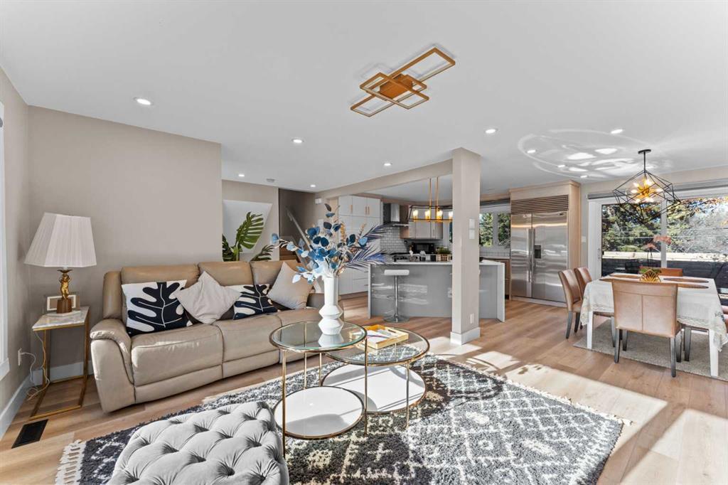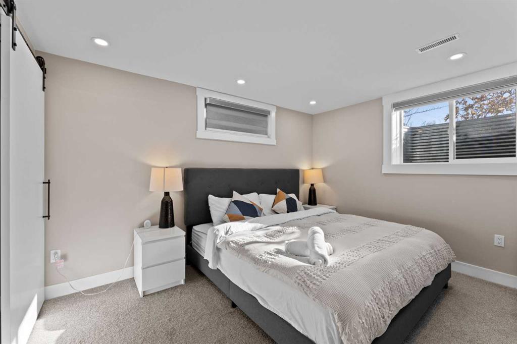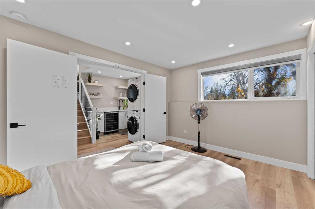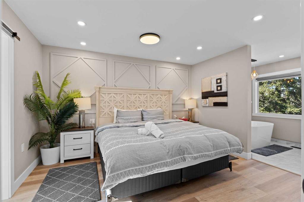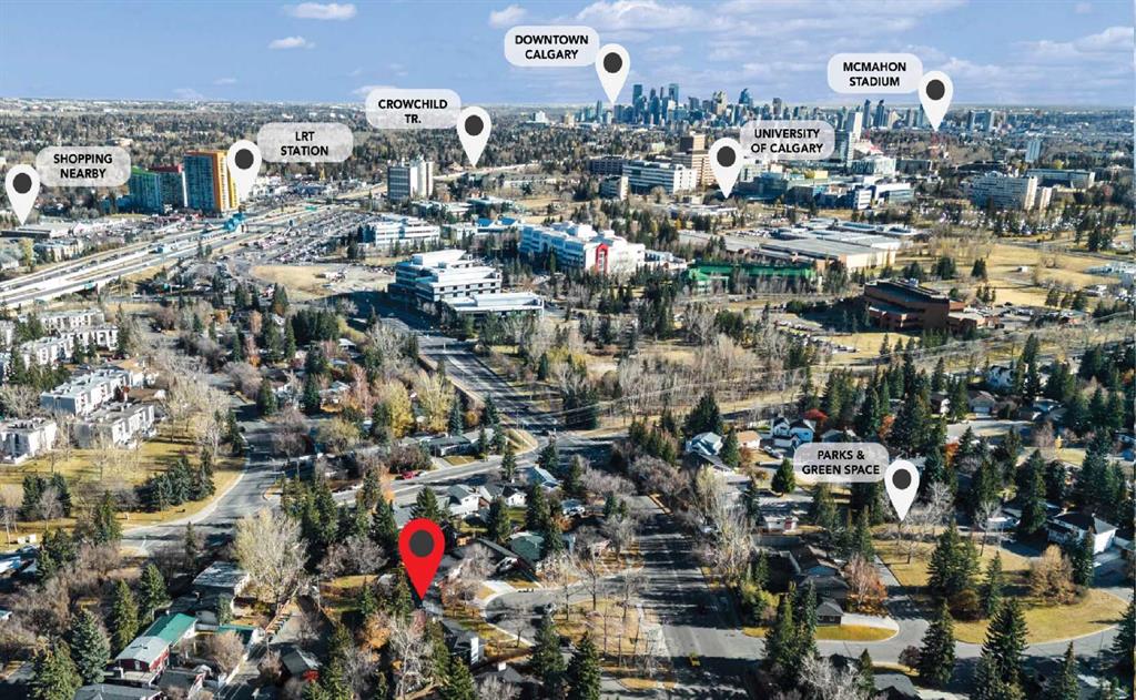 Welcome to this beautifully renovated 5-bedroom, 4-bathroom detached 4-level split offering nearly 2,500 sq. ft. of modern living space on a 7,200 sq. ft. south-facing corner lot overlooking a peaceful green space. This home has been completely remodeled and updated from top to bottom with high-end renovations in the last few years — a perfect blend of elegance, function, and comfort. Enjoy walking distance to Market Mall, U of C, Alberta Children’s Hospital, University District, Brentwood C-Train Station, and many green space/ parks. Families will appreciate the proximity to Sir Winston Churchill High, Marion Carson Elementary, F.E. Osborne Junior High, and St. Vincent de Paul Elementary. Inside, you’ll find a bright open-concept layout with LVP flooring, LED lighting, and modern finishes throughout. The chef-inspired kitchen features custom white cabinetry, quartz countertops, farmhouse sink, and premium appliances including a Viking 36” gas range, Sub-Zero 42” built-in refrigerator, and Fisher & Paykel dishwasher drawers. A cozy modern fireplace anchors the living room and creates an inviting atmosphere. The primary bedroom offers over 300 sq. ft. with a walk-in closet and a luxurious 5-pc ensuite featuring a tiled shower with massage jets, double vessel sinks, heated mirrors, and a deep soaker tub. A second bedroom and 4-pc bath complete the upper level. The third level includes a wet bar with wine cooler and washer/dryer, spacious family room /bedroom with Valor gas fireplace, office/4th bedroom with patio doors, and another full bath. The basement level features a large bedroom with walk-in closet, 3-pc bath, laundry area with Samsung smart washer & dryer, and a kitchenette with eating area (240V electrical outlet installed, ready for a future full stove). Major upgrades also include PEX plumbing, 200-amp electrical service, tankless hot water, high-efficiency furnace, and NEST thermostat. The oversized 24’x24’ garage is insulated and drywalled with 240V power (EV ready), gas line, and rooftop deck for private outdoor enjoyment. Professional landscaping features additional topsoil, drought-resistant sod, and a Wi-Fi-controlled irrigation system. The unique elevated backyard offers excellent potential for future walk-out basement development, either within the existing structure or in a future higher-storey rebuild, or for a garden / back-lane home — a rare-find opportunity in this area. Two decks, a patio, and large open yard complete the outdoor space. This exceptional property offers unbeatable location, luxury, and value — a true move-in ready gem in Calgary’s northwest!