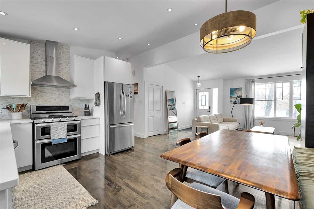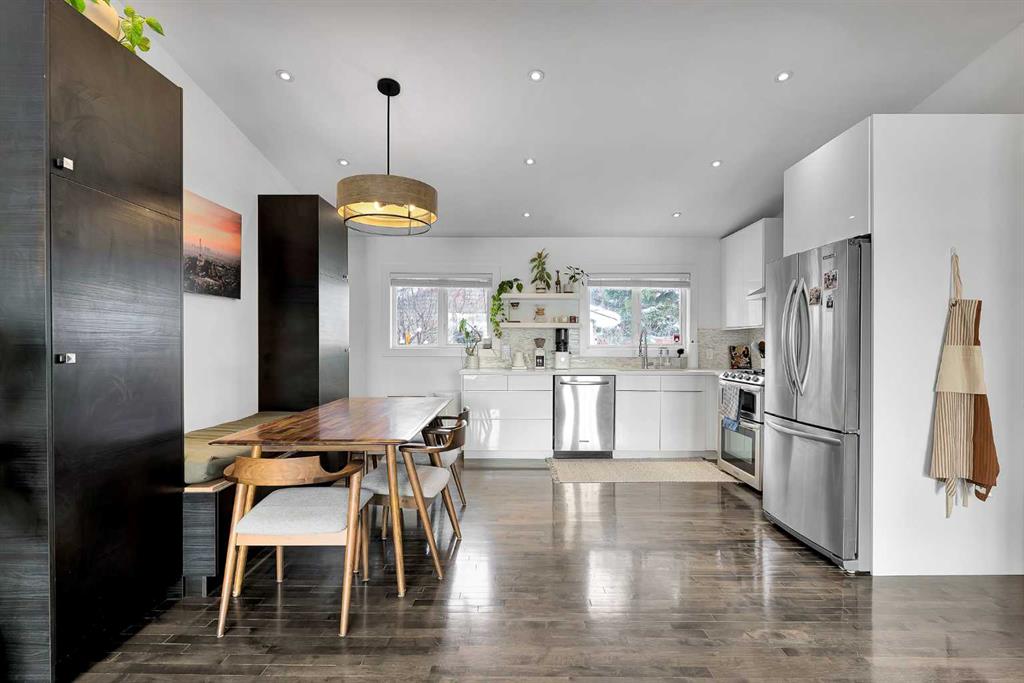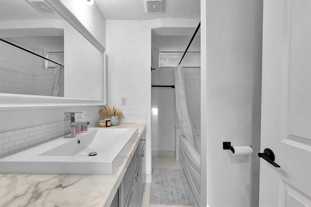 Charming home in a prime Brentwood location—just a short walk to the LRT and a quick 5 minute drive to the University of Calgary. Enjoy the convenience of nearby schools, baseball fields, and an off-leash dog park, making this an ideal setting for families and outdoor enthusiasts alike. Bright and open, this home features a spacious kitchen with quartz countertops, stainless steel appliances, upgraded lighting, ample cabinetry, and a vaulted ceiling. The inviting living area showcases a tiled fireplace, while the main floor offers three well-sized bedrooms and a beautifully renovated bathroom complete with a soaker tub, dual sinks, and heated floors. Hardwood flooring and modern light fixtures run throughout the main level. The fully finished lower level includes a large family room, two additional bedrooms, a den, a 4-piece bathroom, newer vinyl plank flooring, and plenty of storage space. Situated on a large lot, the backyard features a two-tier deck—perfect for outdoor entertaining—and a double detached garage. ***SEE VIRTUAL TOUR***