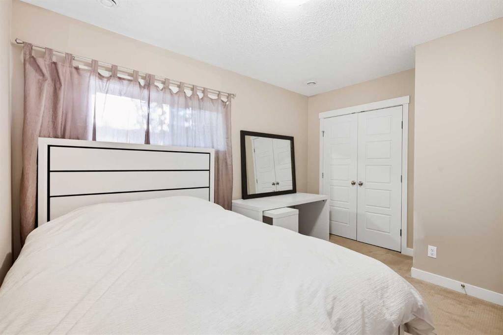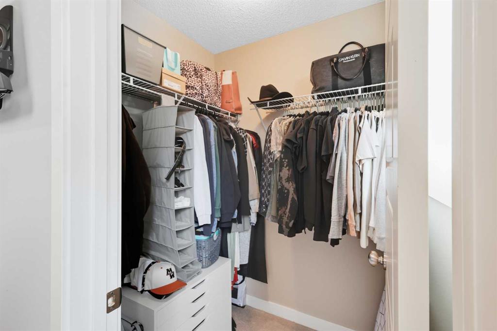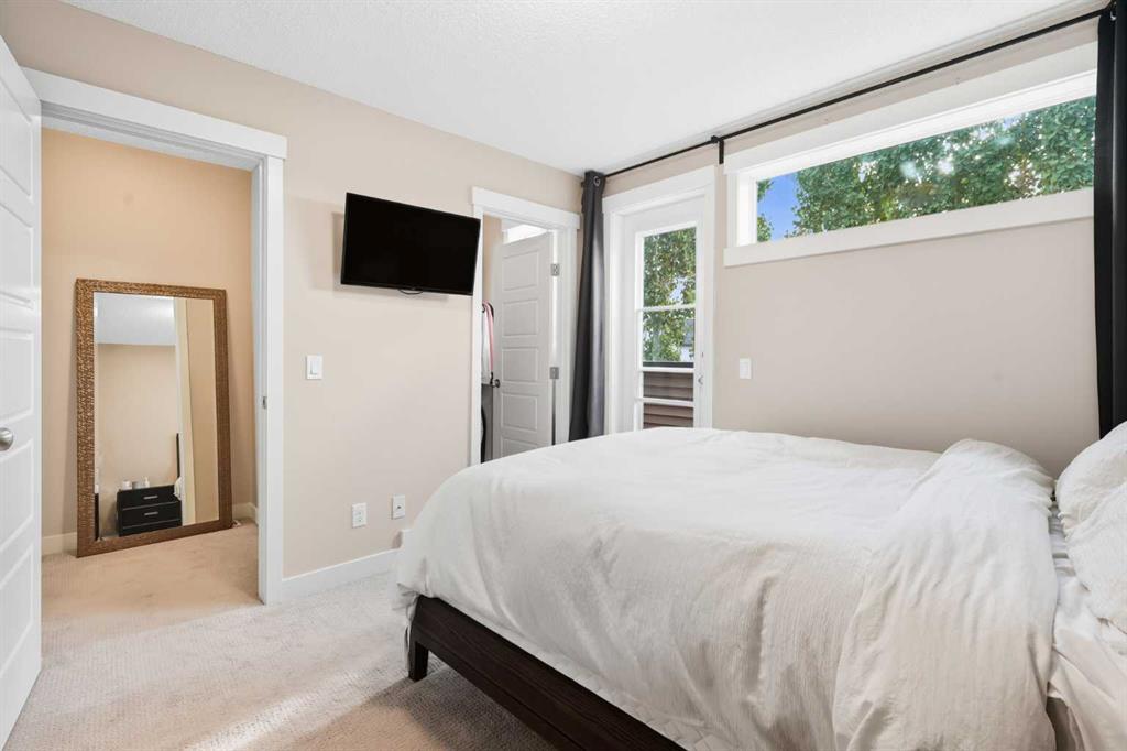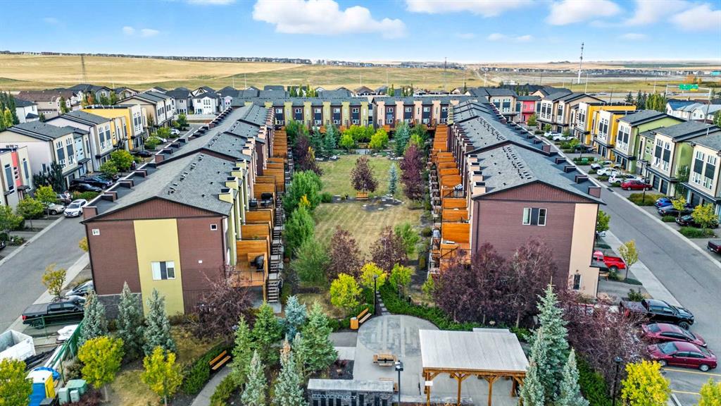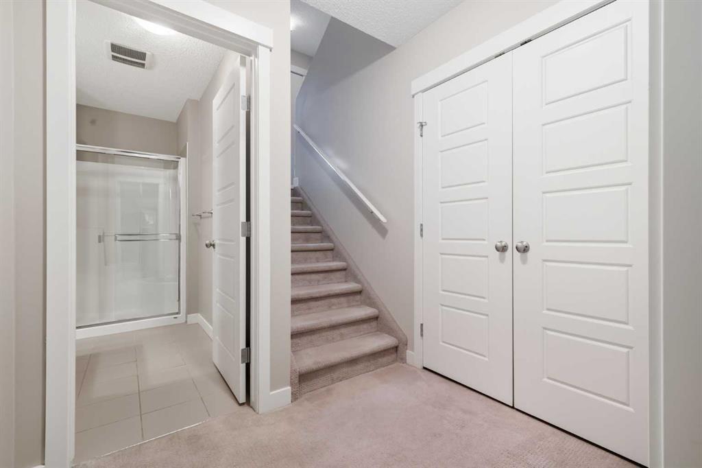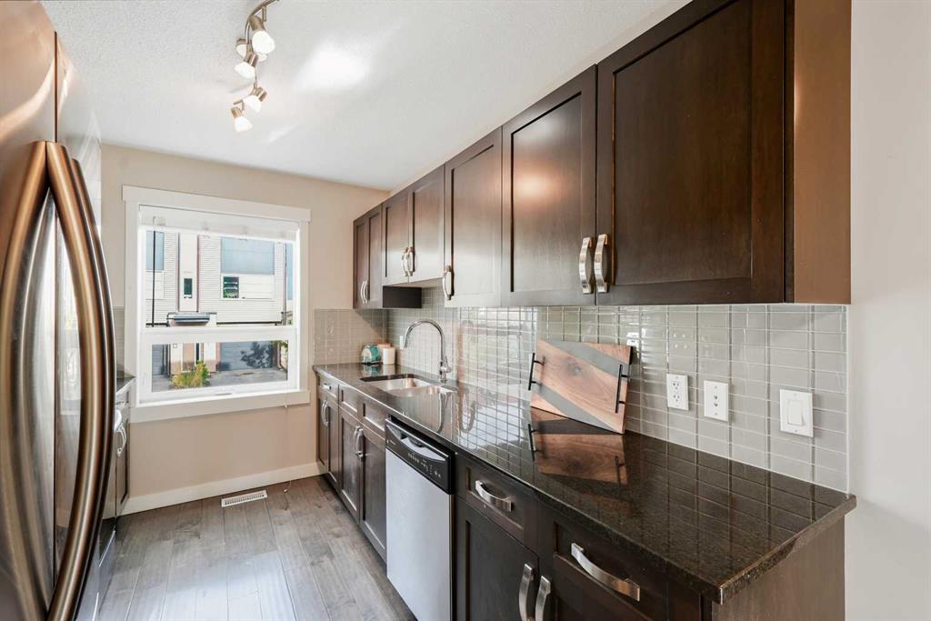 Welcome to this stylish and well-maintained 3-level townhome, located in the vibrant community of Coventry Hills. Just steps from schools, shopping, restaurants, public transit, and with quick access to both Deerfoot and Stoney Trail — convenience at its best. Offering 2 bedrooms, 2 full bathrooms, and over 1,200 sq ft of total living space, this home is designed for both comfort and functionality. The main level features contemporary finishes throughout — including smoke grey engineered laminate flooring, granite countertops, glass tile backsplash, dark cabinetry, stainless steel appliances, and high-profile baseboards. The galley-style kitchen flows into a cozy dining nook and a bright, west-facing living room. Step out onto your private west-facing balcony, perfect for evening sunsets and entertaining. The top floor is dedicated entirely to the primary retreat, featuring a spacious bedroom, 4-piece ensuite with granite, a generous walk-in closet, and a second private balcony — also west-facing for tons of natural light. On the lower level, you’ll find a comfortable second bedroom, a full 3-piece bathroom with walk-in shower, stacked laundry, storage space, and utility room. Includes one assigned parking stall directly out front, plus plenty of visitor and street parking. This is a well-managed complex with low condo fees, offering excellent value for first-time buyers, downsizers, or investors. This home shows beautifully and is move-in ready. FURNITURE NEGOTIABLE! Virtual tour available!