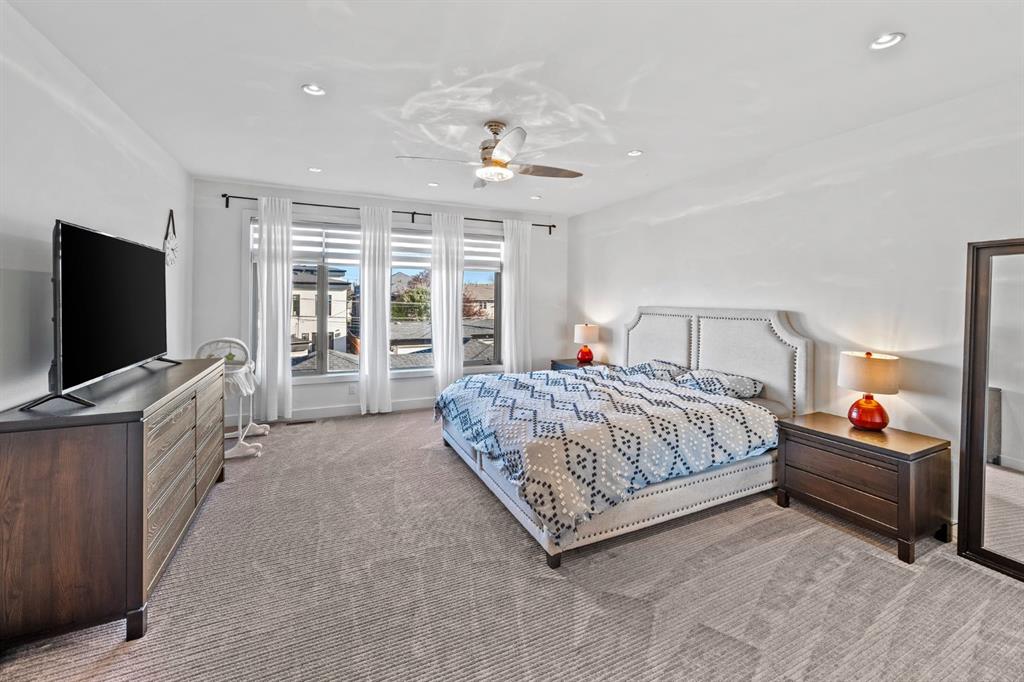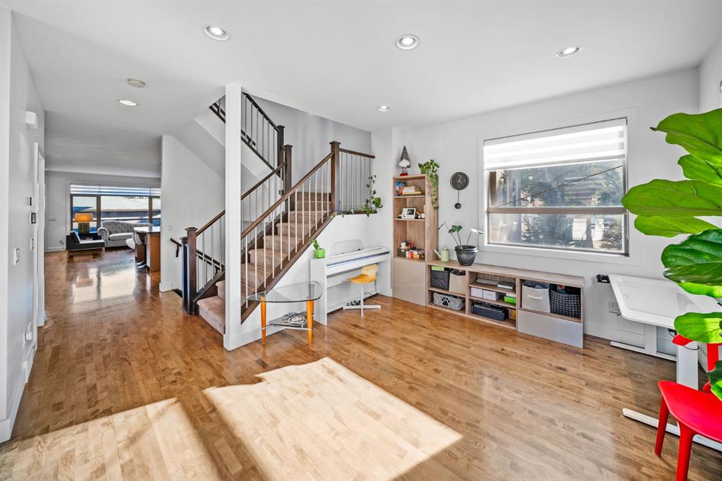 Welcome to refined inner-city living in the heart of Parkdale, just minutes from the Bow River pathways and surrounded by the best of Calgary’s urban lifestyle. This striking contemporary infill blends timeless design with everyday comfort — perfect for professionals, families, and anyone who loves being close to it all. Offering just under 3,000 sq.ft. of beautifully finished living space, this home features 4 bedrooms, 3.5 bathrooms, and a versatile bonus loft designed for real life and effortless entertaining. From the moment you enter, the space feels light, open, and intentional, with 9’ flat ceilings, pot lighting, solid core doors, and custom built-ins throughout. A dramatic open-to-above entry sets the tone, while a front office or flex space and rich maple hardwood floors anchor the main level. At the heart of the home, the chef’s kitchen commands attention with granite countertops, an oversized island, under-cabinet lighting, and stunning custom cabinetry. A premium stainless steel appliance package includes a commercial-style gas range and French door fridge — perfect for both everyday meals and hosting. The formal dining area features a custom built-in buffet, flowing seamlessly into the open-concept great room where a sleek modern fireplace creates a warm and inviting focal point. Upstairs, an extra-wide staircase leads to a bright loft area and an impressive primary retreat complete with two walk-in closets and downtown skyline views. The spa-inspired ensuite offers dual vanities, a large glass shower, and a statement soaker tub — your own private escape at the end of the day. A second upper bedroom is filled with natural light and opens to its own private balcony. The fully finished lower level adds even more flexibility, featuring a spacious third bedroom with walk-in closet and a full bathroom finished with marble countertops — ideal for guests, teens, or a private workspace. Outside, enjoy low-maintenance landscaping, a 6-foot cedar fence, and a private deck designed for summer evenings and relaxed outdoor living. This is inner-city living done right — steps from parks, river pathways, and everything that makes Parkdale one of Calgary’s most sought-after communities.