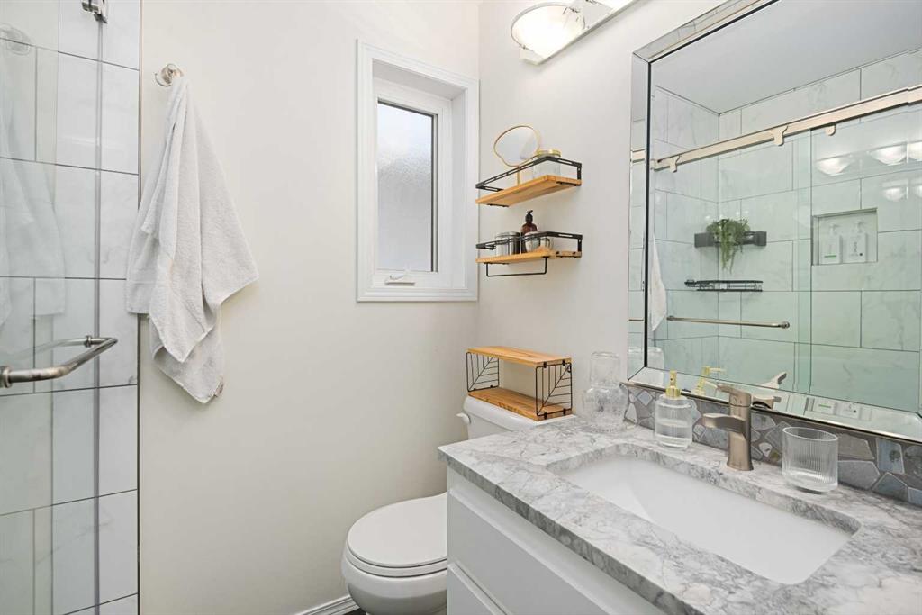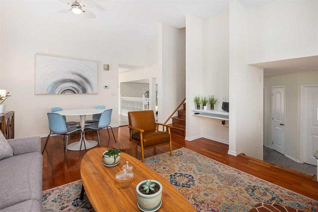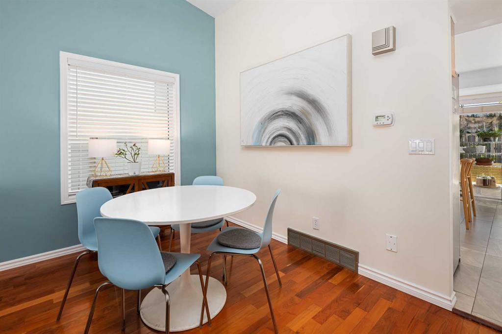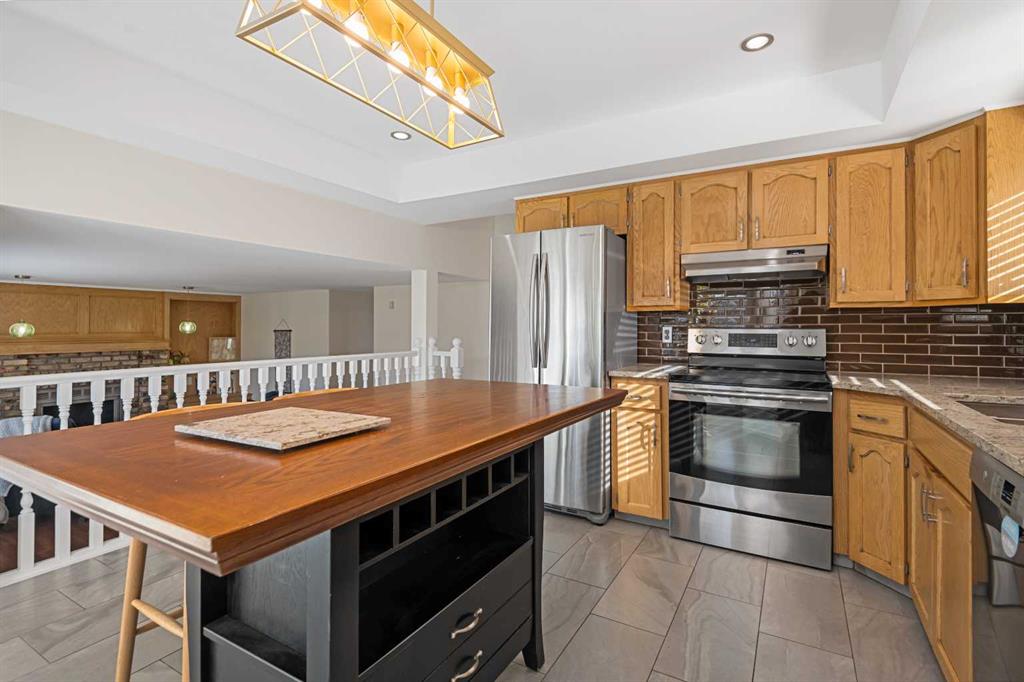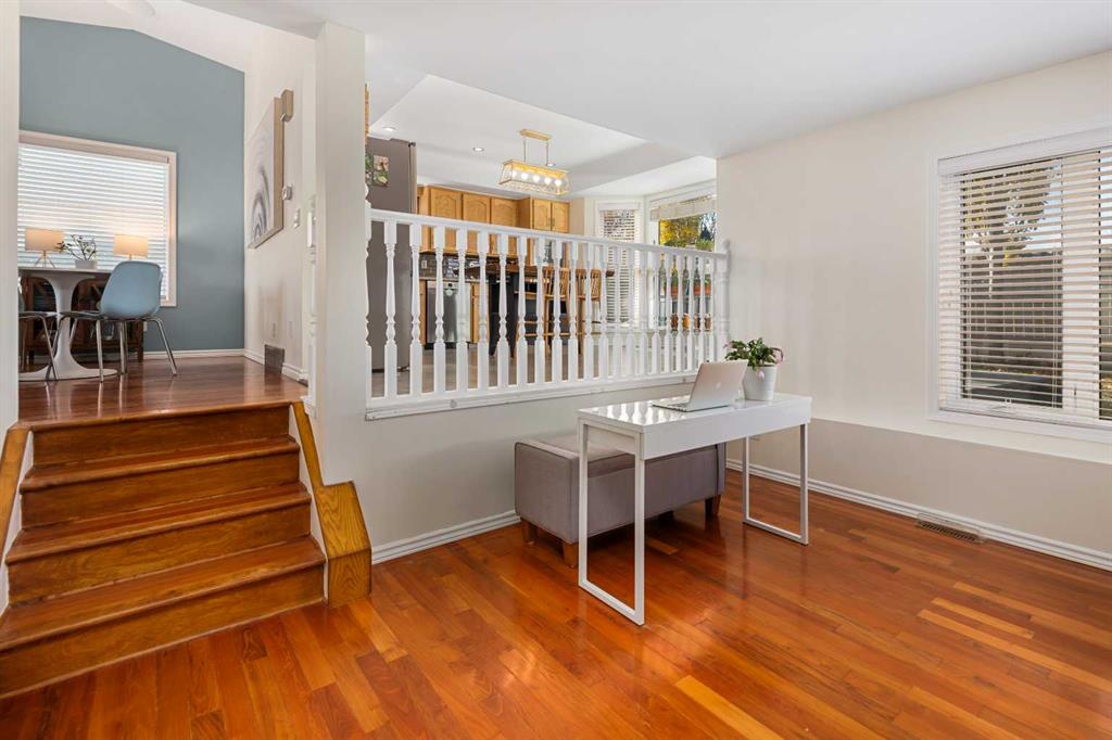 Situated in the NW community of MacEwan, this 4 level split backs onto green space and offers comfort, style, and convenience. Bright, open-concept living and dining room are highlighted by vaulted ceilings and rich hardwood floors which give a spacious and inviting feel. Clean, modern kitchen features oak cabinets, granite counters, and large windows for natural light. The kitchen flows seamlessly into the family room. This space is perfect for entertaining or everyday living. The family room features a cozy wood-burning fireplace with brick accents, built-in shelving, and views to the West backyard. The main floor bedroom offers great flexibility for guests or extended family. This flex space also works as an office or library. A convenient newly renovated 3 piece bath completes this level. Upper floor primary suite is a large space with walk-in closet, new 3 piece bath including walk in shower and sightlines to the green space. Two more bedrooms and renovated 4-piece bath complete this floor. New vinyl plank flooring has been installed on this level. Freshly painted, the basement awaits your design ideas. An insulated, drywalled double attached garage will keep your vehicles warm this winter and offers more storage. The west-facing backyard is a tranquil space with mature trees, no rear neighbors and green space beyond. This home has been well maintained and is freshly painted. There are new light fixtures, newer furnace, and hot water tank. For your comfort, insulation has been added to the attic, and vented fans added to the bathrooms. Of course, there is A/C for the warmer months. MacEwan Park offers pickleball and tennis courts, playing fields and a playground right outside your door! Nose Hill Park is a short drive or bike ride away. An easy commute to downtown, U of C, and SAIT.