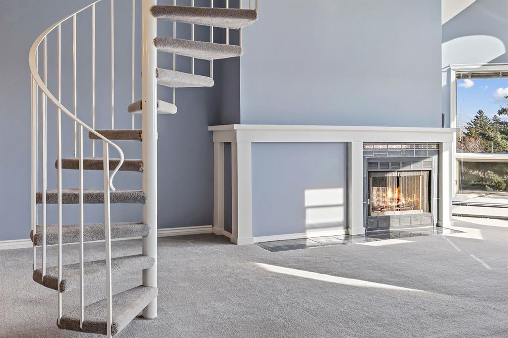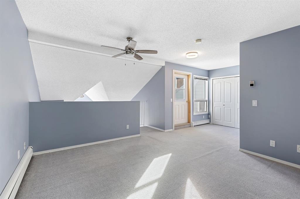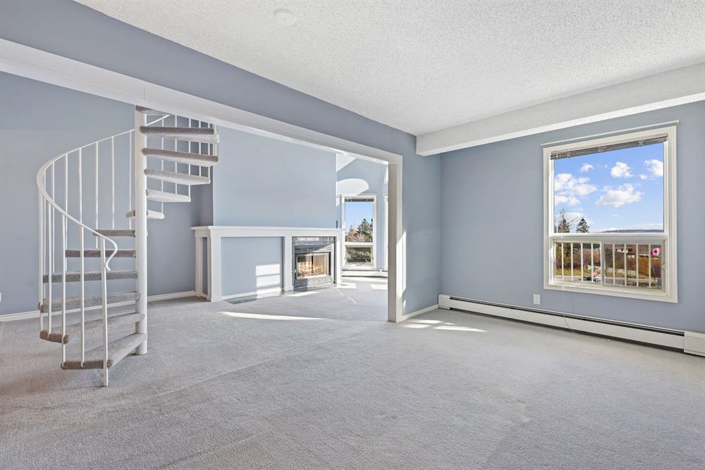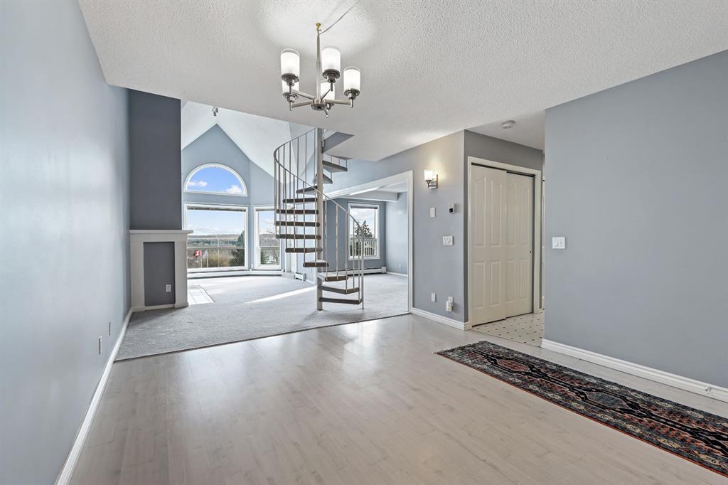 Welcome to #309, 102 Centre Court SW in Okotoks a perfect blend of comfort, space, and boutique condo living. This rarely available 2 bedroom, 2 bathroom, two-storey unit offers 1,354 sq. ft. of thoughtfully designed space in a quiet, 45+ age restricted community. Step inside to an open and airy layout, highlighted by large windows that fill the living room with natural light and frame stunning views of Okotoks and the Rocky Mountains to the southwest a picturesque backdrop to everyday life. To the right, a spacious dining area is ideal for family dinners and entertaining. To the left, a functional kitchen offers ample storage and workspace. The striking spiral staircase leads to the loft, which serves as the primary bedroom and features a private balcony, perfect for morning coffee or evening sunsets. Both bedrooms are generous in size, and the layout provides privacy and flexibility. The unit includes a titled, heated underground parking stall, keeping your vehicle secure year-round. The building offers fiber optic internet, is peaceful, well-maintained, and designed for low-maintenance, mature living. If you’ve been waiting for a condo with space, views, character, and convenience this is the one. Come experience the best of Okotoks living.