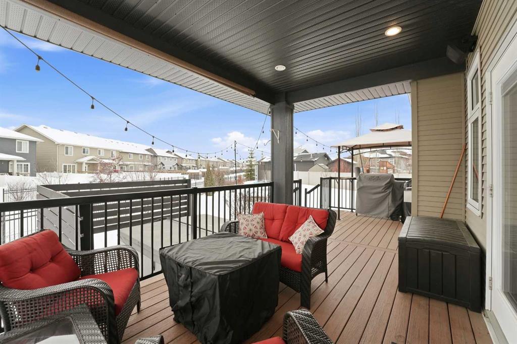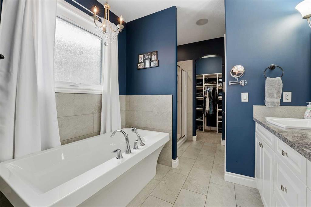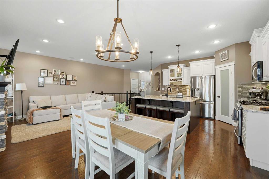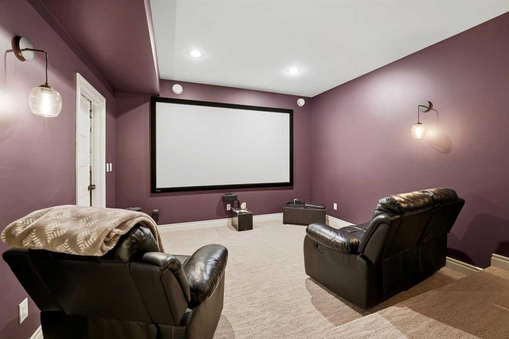 Executive-style fully developed bungalow backing onto a walking trail, located on a massive SOUTH-facing pie lot in a quiet close! 5 bedroom + office, 3 bathroom home offers upscale finishes, functional design, and exceptional space throughout. The open-concept main floor features 9 ft ceilings, pot lights, and lighted niches. The chef’s kitchen includes custom cabinetry with crown moulding, granite countertops, full tile backsplash, built-in wine rack, gas range, corner pantry, and a large island with undermount sink and lowered eating bar. The living room is anchored by a gas fireplace with stacked stone surround, and the dining area opens to a south-facing covered deck with maintenance-free decking. The spacious primary suite accommodates a king bed and features a walk-in closet and spa-like 5pc ensuite with soaker tub, dual vanities, separate shower, and private water closet. A second bedroom, full bath, main floor office, mudroom with built-in lockers, and main floor laundry with cabinets and sink complete the level. The fully finished basement offers a big family room with wet bar, a media room with built-in speakers, projector and tiered seating, plus three additional bedrooms and a 5pc bath with dual sinks. In-floor heat adds year-round comfort. The heated triple attached garage is fully finished with epoxy floors, floor drain, and a drive-through door to the backyard with extra parking pad. The beautifully landscaped yard includes mature trees, shrubs, perennials, area for a hot tub, fire pit area, shed, and direct access to the walking path leading to green space and playgrounds. Additional features include central air conditioning, Gemstone lighting, gas stove, newer 75-gallon hot water tank (2024), and exceptional curb appeal.