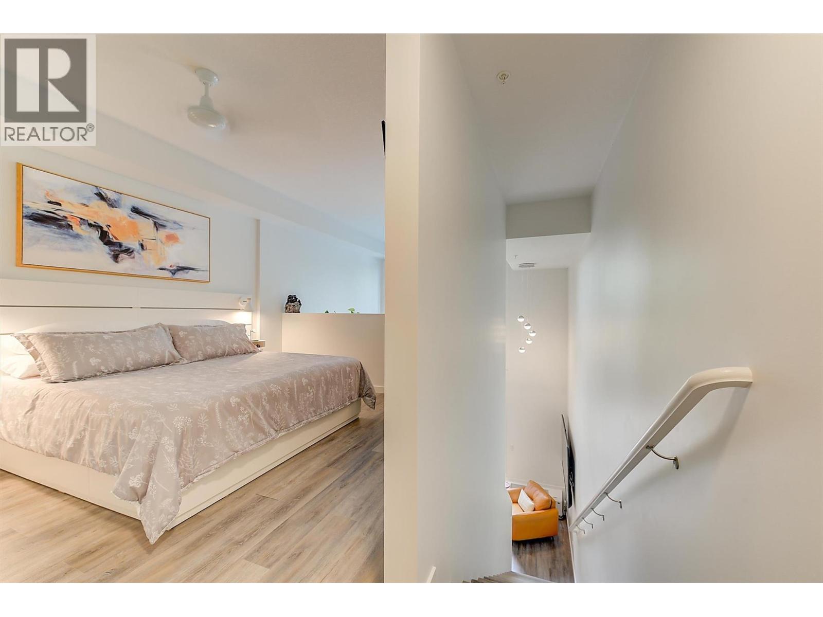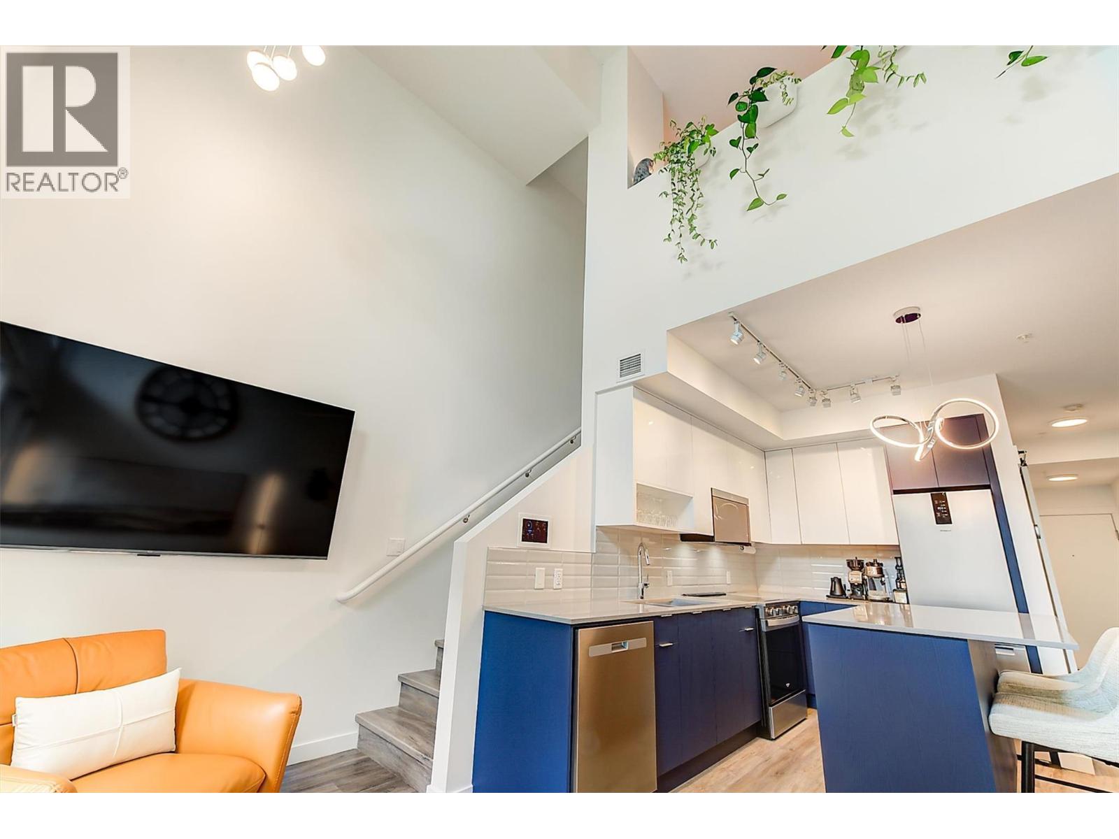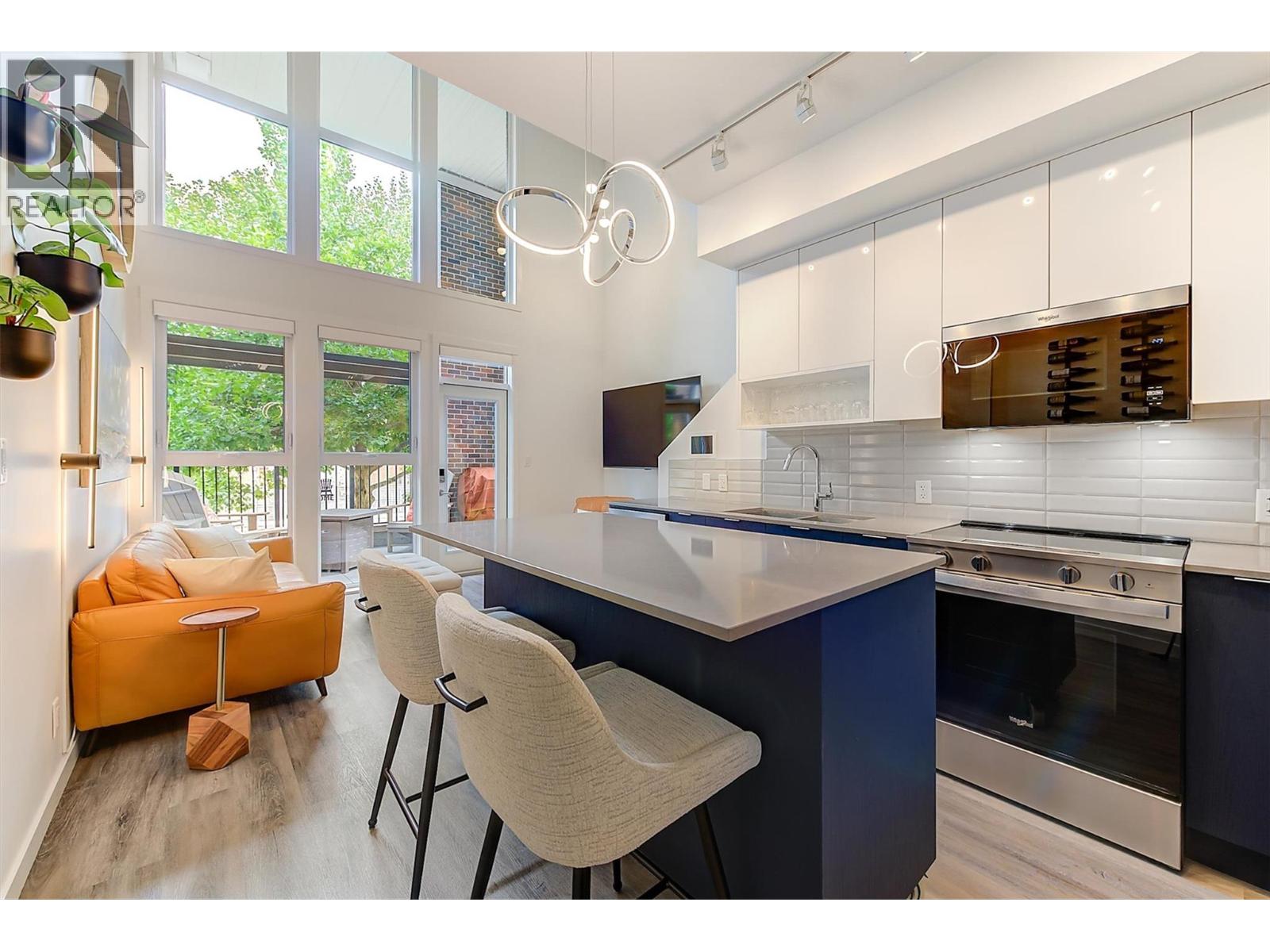 Bright, Urban Chic Loft-style condo at Central Green! This 2-bedroom, 2-bathroom home offers entrances to both levels with towering 18 ft ceilings and impressive oversized floor to ceiling windows allowing the natural light to flood your living space. The open layout showcases a sleek kitchen with contemporary dual tone cabinetry, Upgraded Stainless Steel appliance package, light quartz countertops, a moveable island workstation, all flowing into a cool, luxe living area with elegant modern lighting. Durable, great looking & easy care Luxury Vinyl plank is found throughout, perfect for entertaining & ideal for pets ( 2 dogs, 2 cats or 1 of each allowed - no size restriction here). Find an east-facing terrace with a beautiful brick facade and black accented frosted glass privacy panels to enjoy your morning coffee as the sun rises or enjoying a fresh Okanagan evening. The Lofted primary bedroom overlooks the main living area below, offering ample closet space, a 3pc ensuite bath & laundry. The main floor 2nd bedroom is ideal for guests, crafts, a home office, or a studio. Practical perks include a secure Underground parking stall, plus a convenient, same floor storage locker. Central Green is situated beside the pristine Rowcliffe Park with running loop, playground, and beautiful green space. THIS is all in walking distance to beaches, schools, shopping, dining, and Kelowna’s vibrant downtown easily accessible via the Bertram Pathway & Multiuse Overpass & transit is out front!