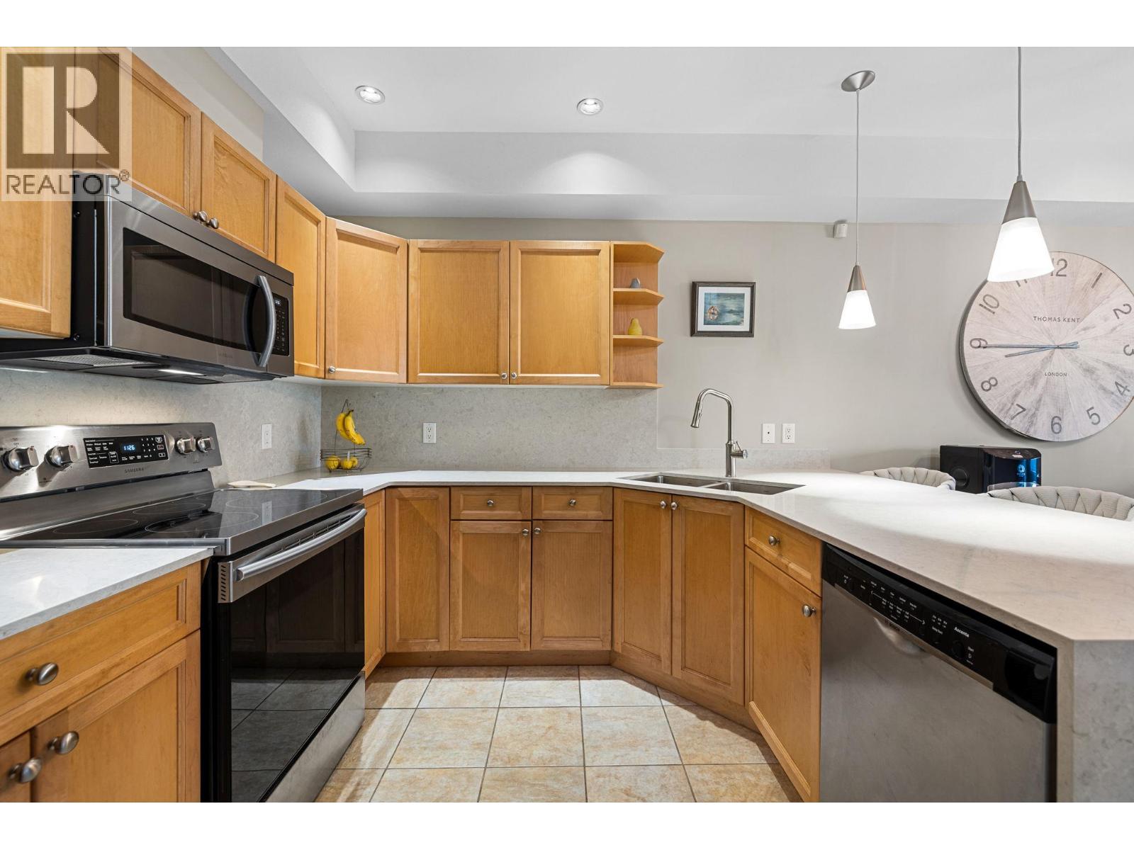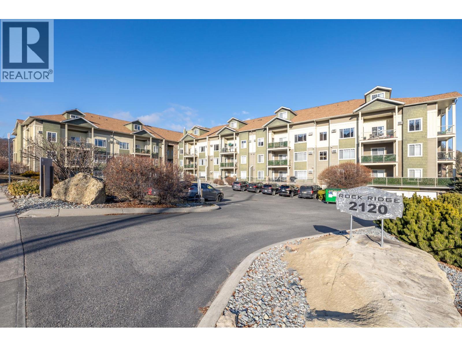 Conveniently positioned ground-floor 2-bedroom condo in Rock Ridge, located in the heart of Shannon Lake offering one of the only layouts in the building with two separate A/C units for exceptional year-round comfort. The home features a stunning open-concept peninsula kitchen with premium waterfall quartz countertops and seamless backsplash by RevitaStone, arguably the nicest in the building, making everyday a pleasure to cook and entertain with ample space for a sectional in the living room for comfortable gathering areas. Enjoy a quiet, park & trail view covered patio, one of the largest non-corner unit balconies in the complex, creating a private, peaceful, naturally shaded outdoor retreat. Perfect for that morning coffee or evening relaxation. Set in a family-friendly, nature-rich neighbourhood, this home is within walking distance to both elementary and middle schools, parks, trails, golf (Hole 3), and Shannon Lake. Pet friendly (1 dog or cat, 18"" at the shoulder). Includes truck size underground parking stall with a direct-access storage locker behind. A rare combination of comfort, quality upgrades, privacy, and location in one of West Kelowna’s most desirable communities.