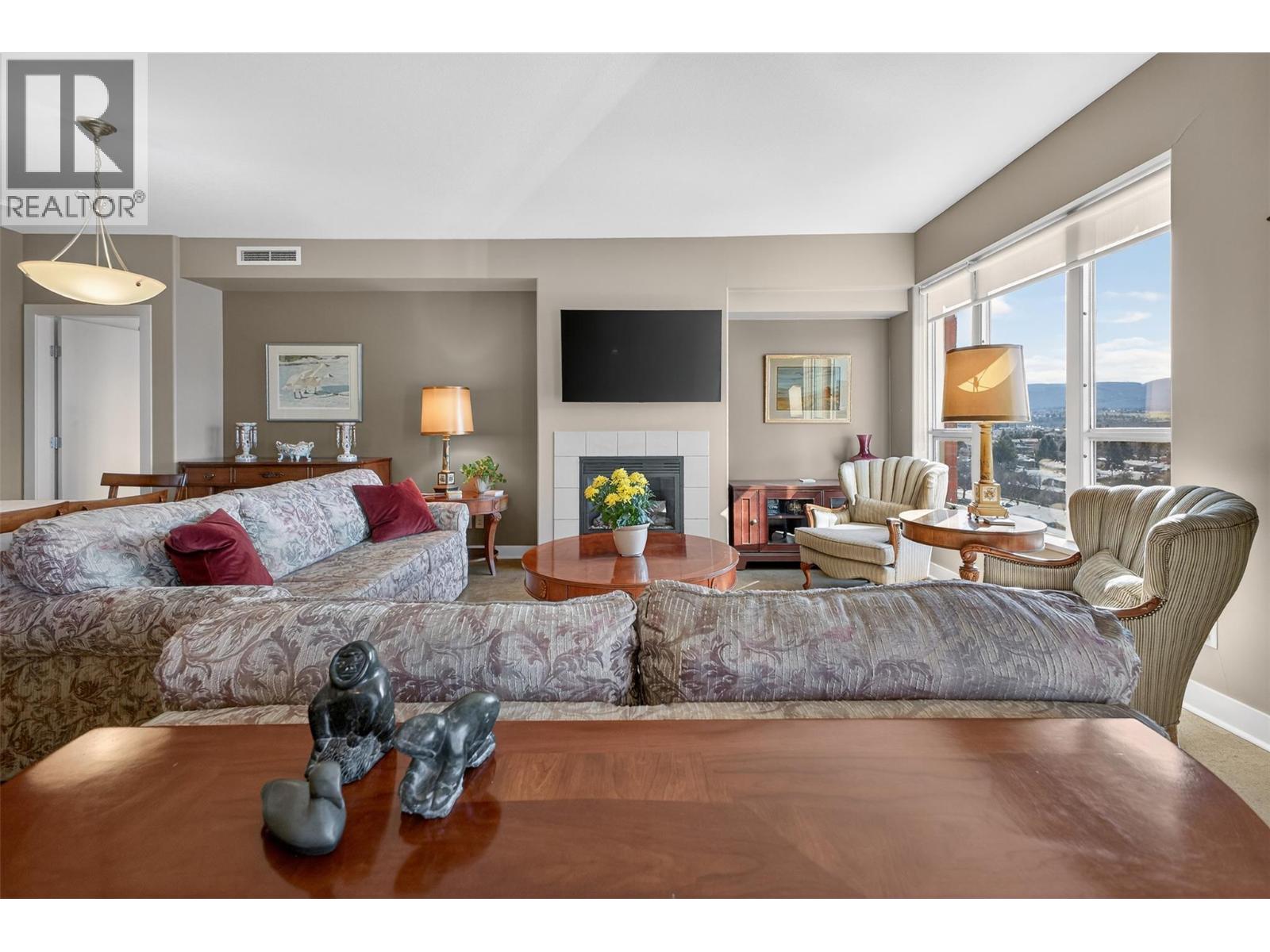 There’s nothing quite like the high standard of condo living that Centuria offers in the heart of Kelowna! This 11th-floor corner suite captures a 180-degree southwest view over the lake, city, and mountains, with natural light pouring in from multiple exposures throughout the day. With nearly 1,500 sq ft, the layout is open and functional, featuring 2 bedrooms with huge walk-in closets, a functional den, and 2 full bathrooms. The kitchen is designed for everyday ease and entertaining, with granite countertops, a large sit-up island, and newer stainless steel appliances. The main living area features cork flooring, with carpet in the bedrooms and tile in the bathrooms for a balanced, comfortable finish. Located just minutes to all the amenities one needs: a grocery store downstairs, downtown dining, shops and entertainment - everything is within easy reach whether you walk, bike, or drive. Residents enjoy access to an outdoor pool, hot tub, sauna, car wash, and a fitness facility. This condo also includes two secured underground parking stalls and a storage locker. Centuria is also pet friendly!