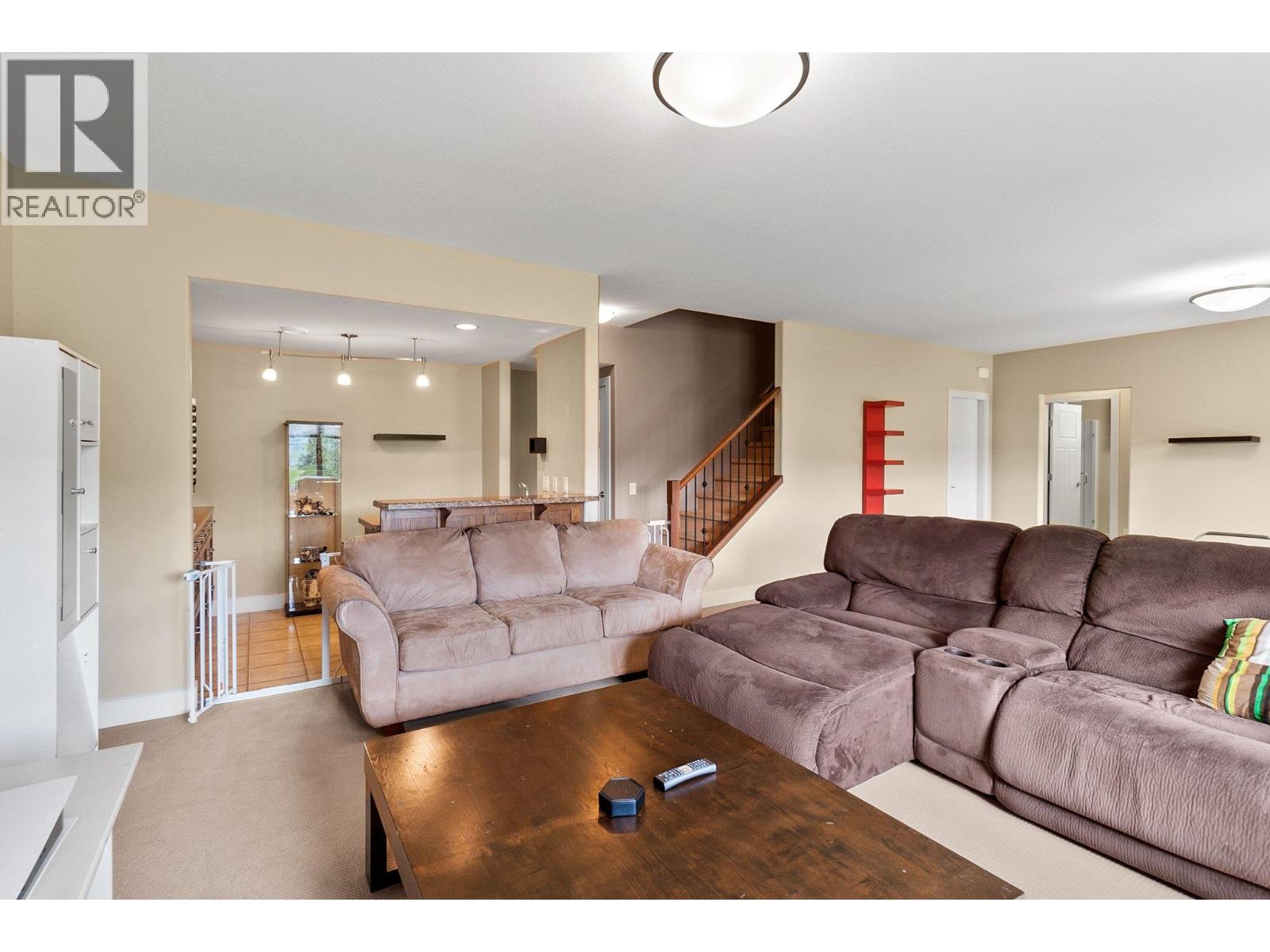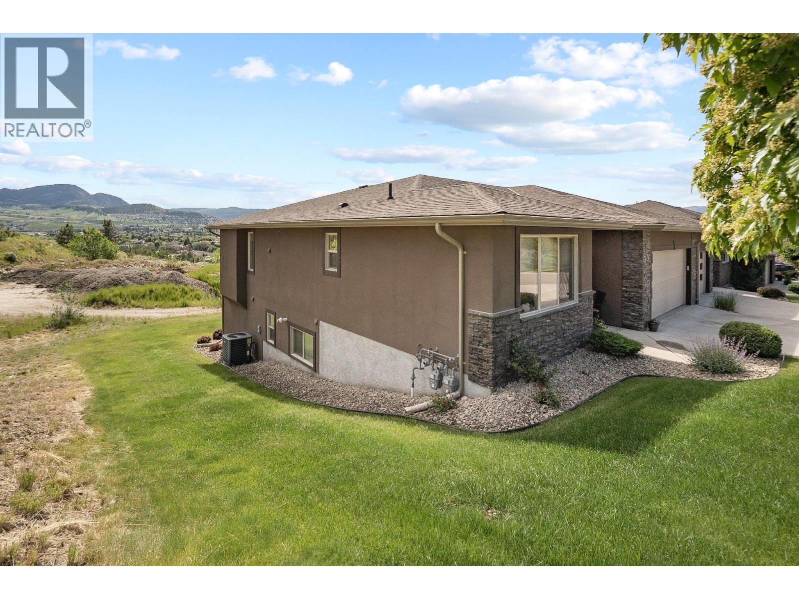 Discover this exceptional 4-bedroom townhome, designed to offer the comfort and privacy of a single family home. Tucked away at the end of the complex, this prime location ensures unmatched tranquility and a generous yard perfect for outdoor living. Enjoy breathtaking mountain and valley vistas from your expansive deck or enjoy quiet moments on the patio below. Step out to the Rail Trail for a scenic 15-minute bike ride to the beach—or venture further to Vernon for an adventurous day out. Constructed in 2010, this walk-out rancher impresses with elegant hardwood floors, two cozy gas fireplaces, and a spacious double garage with ample driveway parking for guests. The main floor welcomes you with a bright, open-concept kitchen, dining, and living area—ideal for entertaining or relaxing at home. Retreat to the luxurious primary suite, featuring a walk-in closet and a spacious ensuite with double sinks, a soaking tub, and a separate shower. A versatile second bedroom or home office and a stylish three-piece bath complete this level. Downstairs, enjoy a large family games room and wet bar for fun gatherings, two additional bedrooms, and a full bathroom—plus laundry facilities on both floors and abundant storage throughout. This is your chance to own a home that truly has it all!
