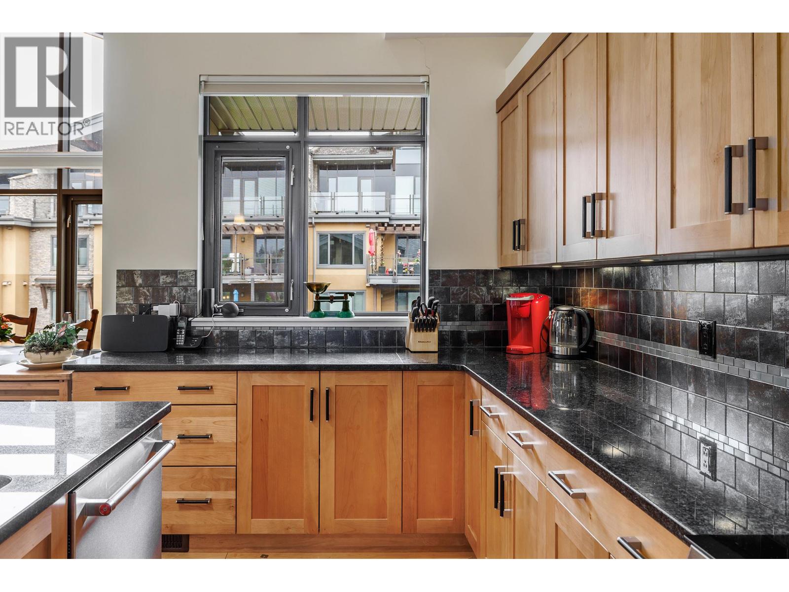Top-floor corner suite in one of Kelowna’s most coveted neighbourhoods offering privacy, style, and a true lock-and-leave lifestyle. The home offers 16–18 ft vaulted ceilings and floor-to-ceiling windows flooding the open-concept living space with natural light, highlighting rich hardwood floors and beautiful finishes throughout. The kitchen is a chef’s dream, featuring granite countertops, shaker cabinetry, and premium KitchenAid and Bosch appliances. The living area exudes warmth with a natural gas fireplace framed by a floor-to-ceiling feature wall and seamless access to a spacious partially covered deck with glass railing, gas hookup, and sunshade, perfect for morning coffee or evening entertaining. The thoughtful floorplan separates the beds from the main living area, including a generous primary suite with a walk-in closet and spa-inspired 5-pc ensuite. Geothermal heating/cooling, two parking stalls, and an oversized storage unit add unmatched convenience. Residents enjoy resort-style amenities: pool, clubhouse, fitness centre, and expansive patio. Walk to beaches, cafes, and schools, this is Okanagan living at its finest.