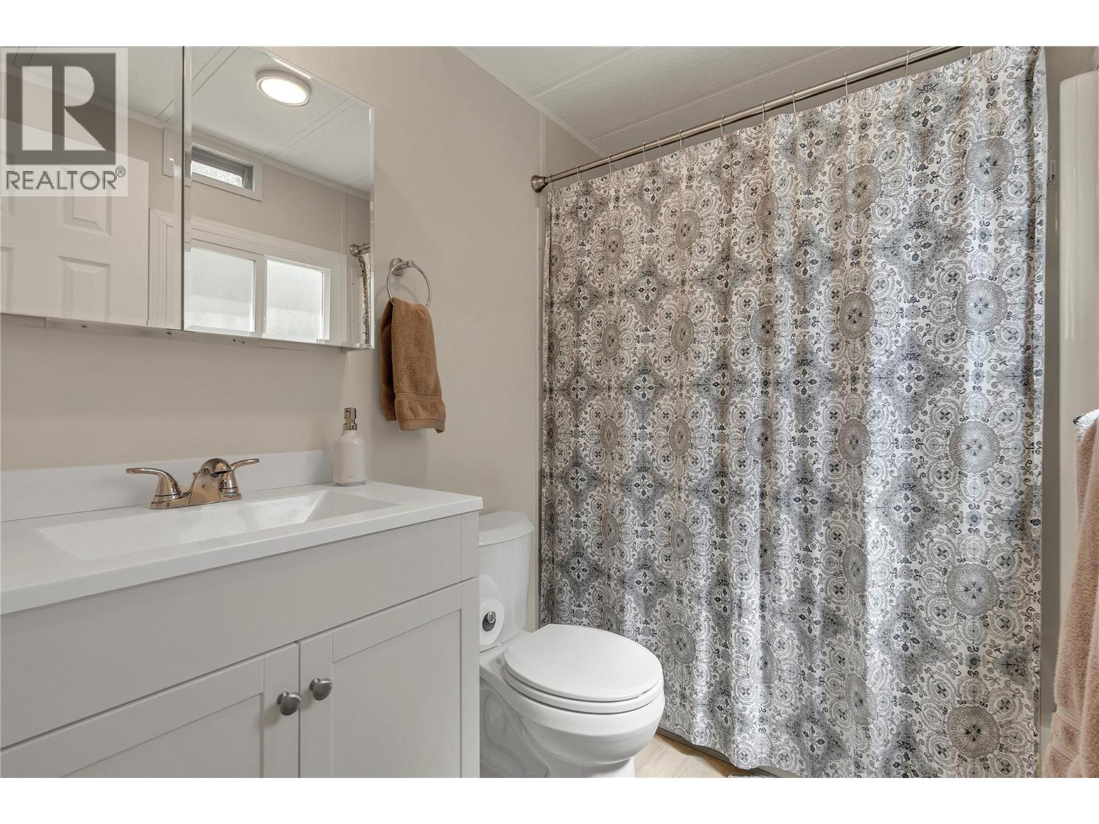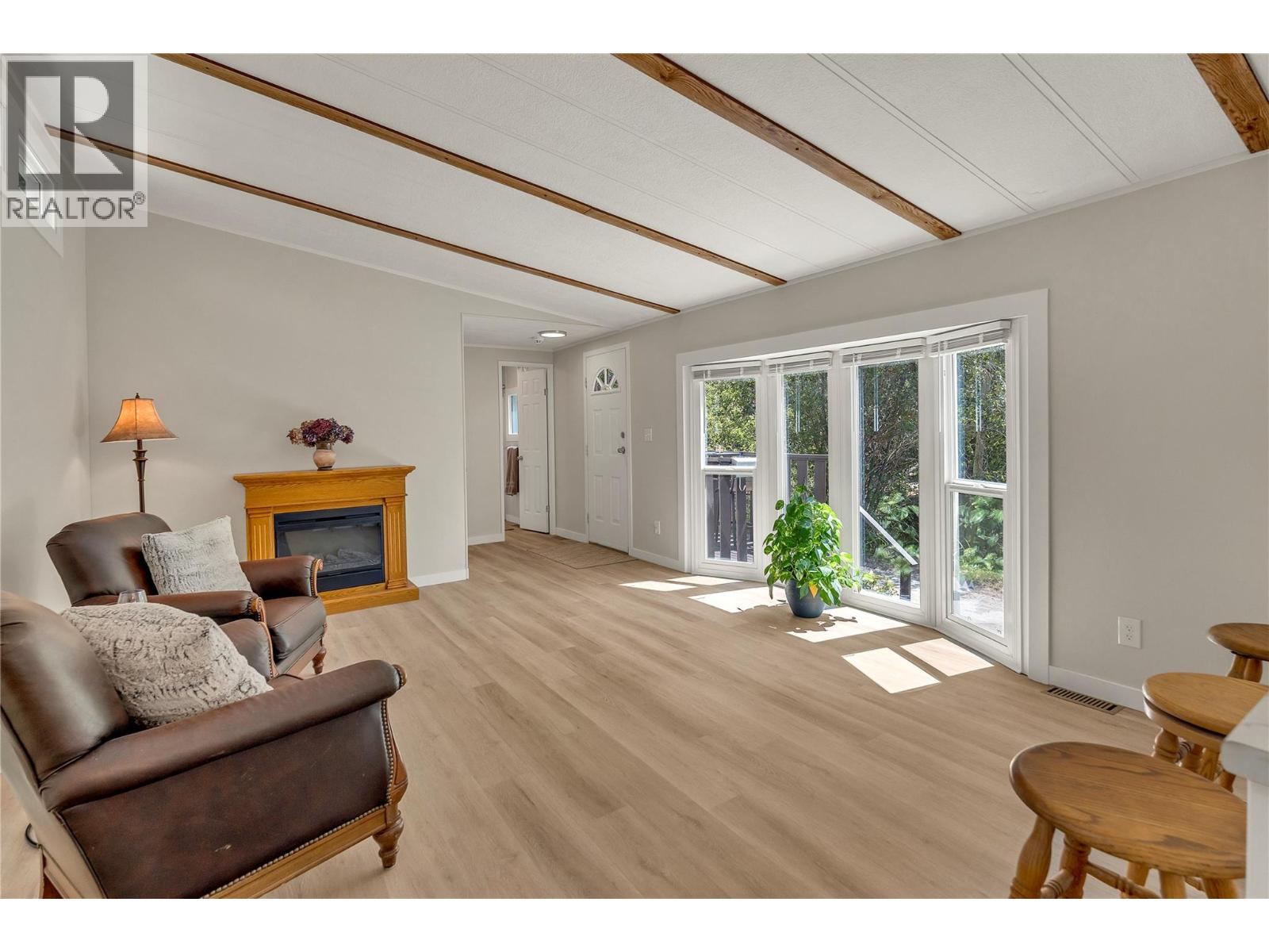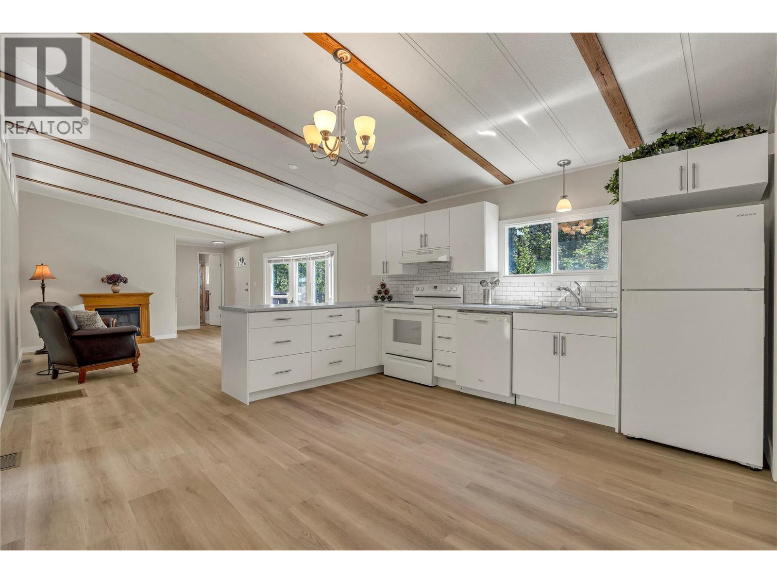 Welcome to Pleasant Valley, one of the most unique mobile home parks in the Okanagan—just a short, level drive to the heart of Penticton. Surrounded by nature and bordered by the ever-flowing, beautiful Penticton Creek, this park offers a peaceful setting unlike any other. This substantially renovated 3-bedroom, 2-bathroom home is tucked away in a private, low-traffic area across the creek, where the soothing sound of water and the natural surroundings create a serene atmosphere. The home feels far from a typical mobile, with its high shed-style ceilings, abundant natural light, and absence of narrow hallways. Inside, the impressive renovations include a new kitchen and bathrooms, updated flooring throughout, fresh interior and exterior paint, modern light fixtures, and plumbing. Outside, the spacious yard is ideal for outdoor living and hobbies, featuring a large covered deck, a flat and private backyard, and even a small patio area overlooking the creek. There is ample parking, and the park also offers RV parking (subject to availability and a monthly fee). Pleasant Valley is a well-managed 55+ community that allows two pets (size restrictions apply).