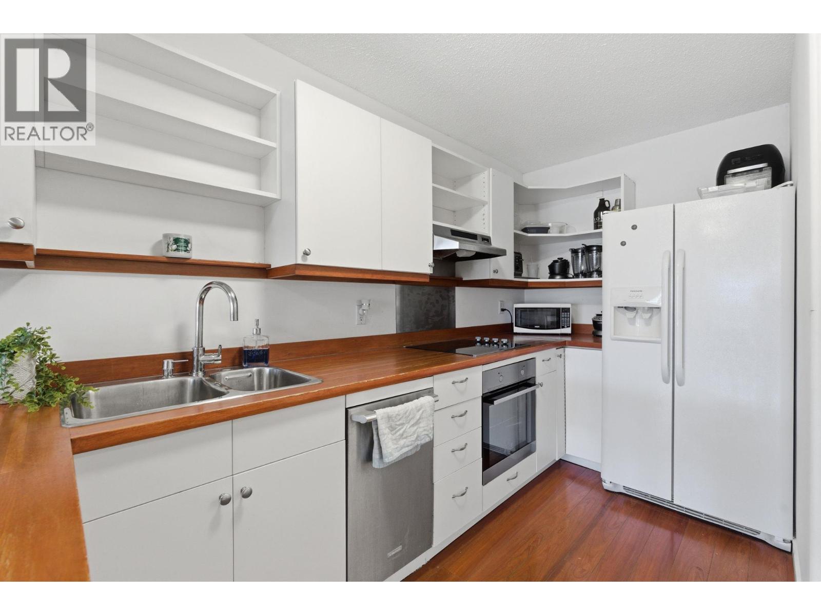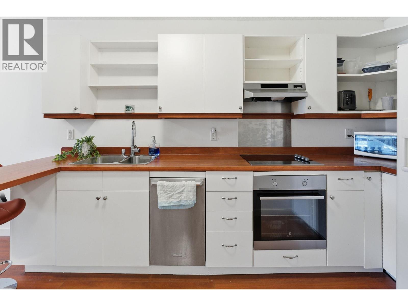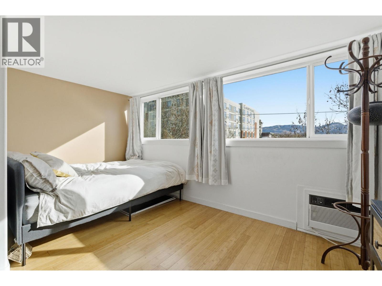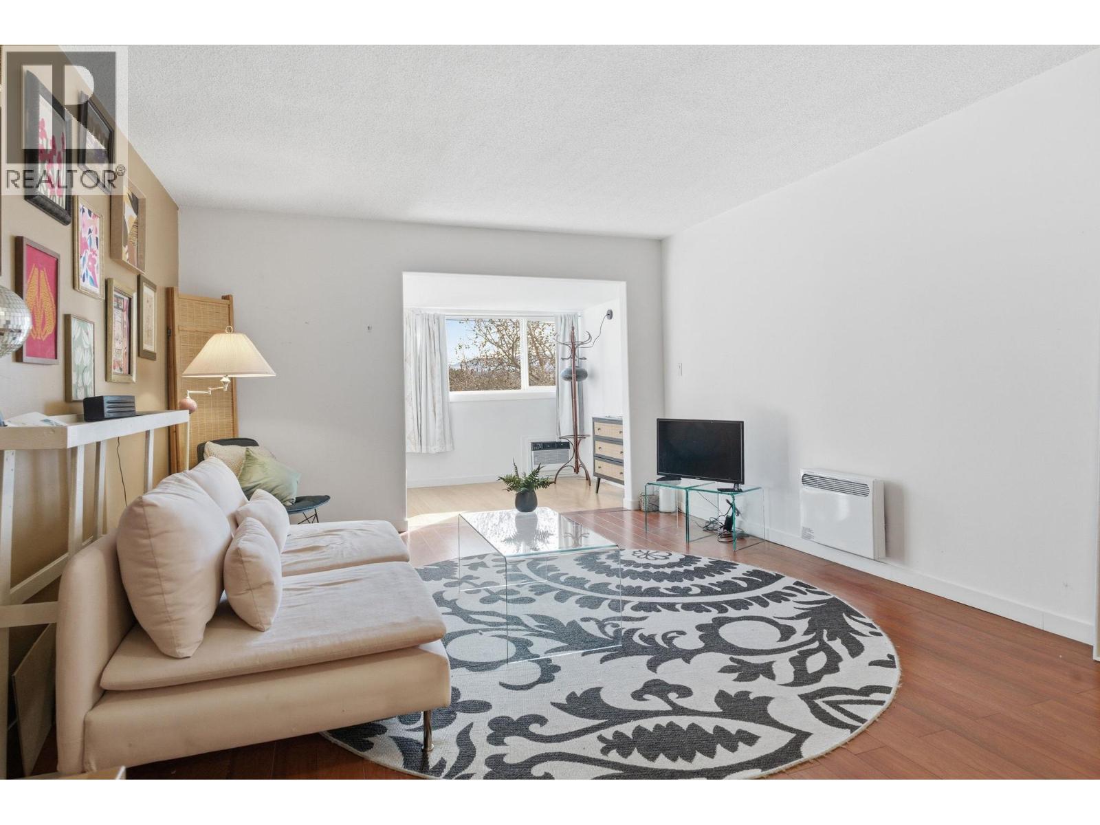 Beautfully bright, open, affordable Top Floor 1 bed/1bath condo in the heart of Kelowna. Location, Location. Tucked away in a quiet little cul de sac close to the soon to be new Parkinson Rec Center, parks, pickleball, transit, the rail trail and shopping. This one bedroom was originally a large studio that has been converted into a one bedroom. Flooded with morning light this east facing unit has a 4 piece bath, good-sized kitchen area with peninsula bar for extra counter space and eating area and newer Electrolux appliances: Dishwasher, induction cook top & oven. Underground secure parking stall #30, Storage on same floor #310. Tamarack Terrace has on on-site friendly, helpful building manager, is a well-run strata and a welcoming community. Whether you're a first-time buyer, a student a down-sizer or an investor this centrally located home is a smart choice with great potential.