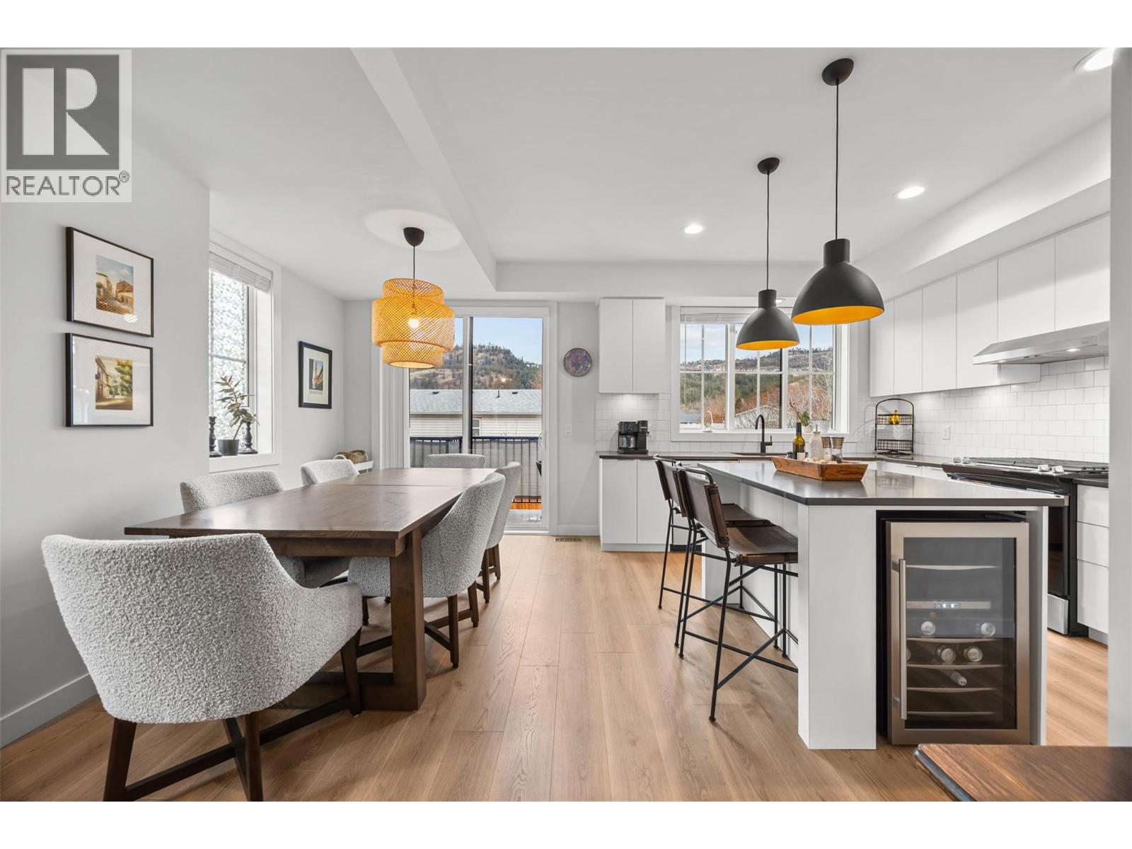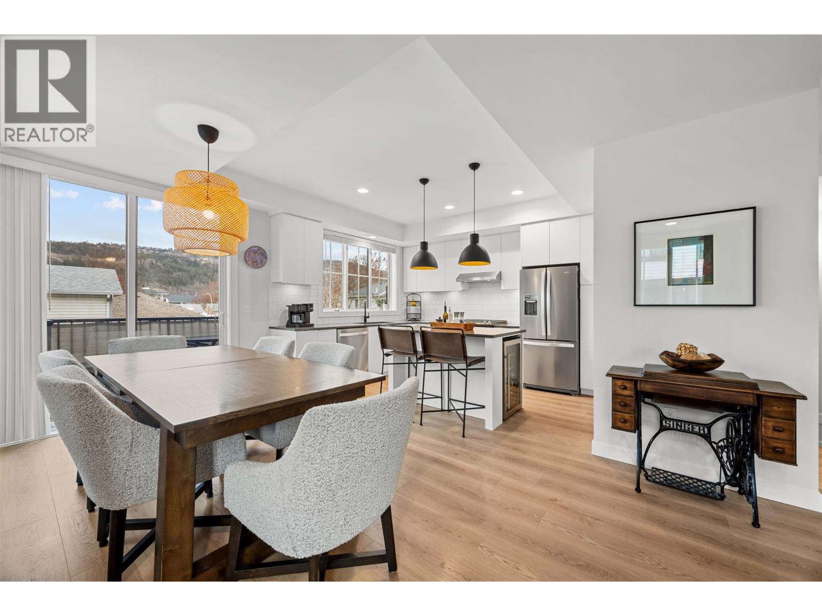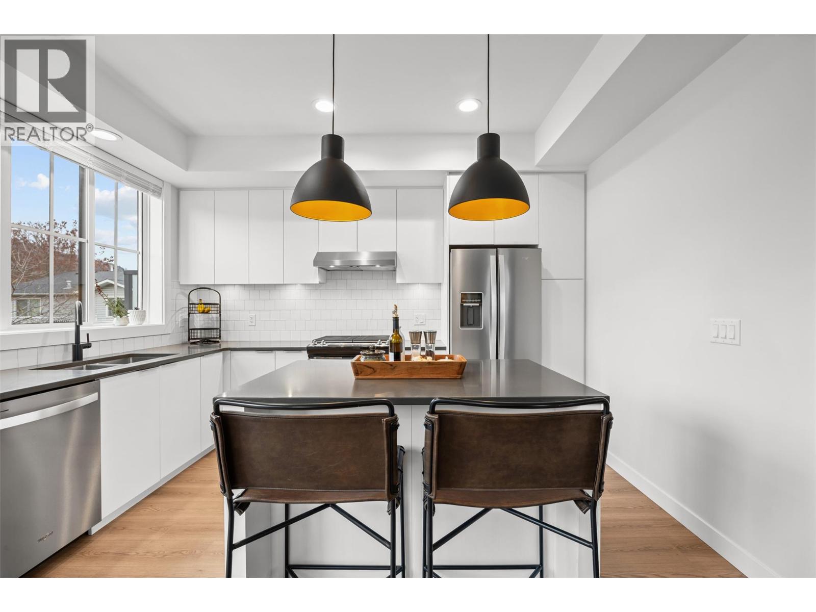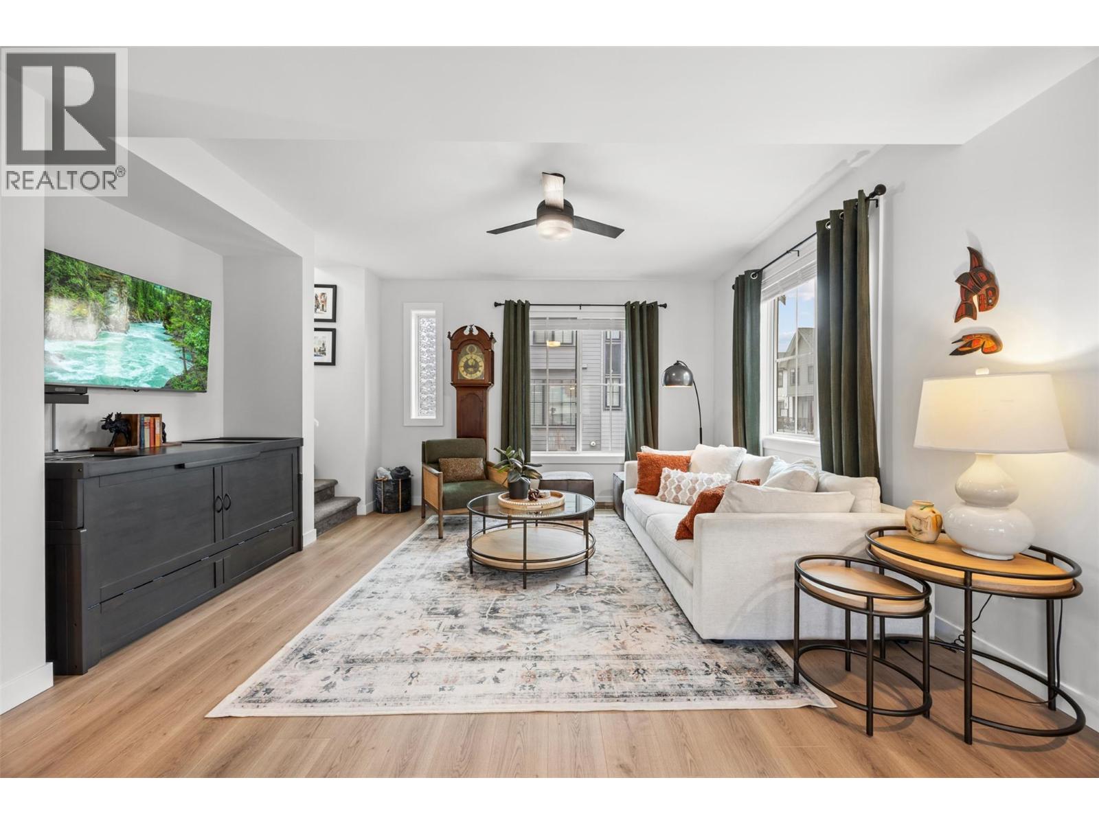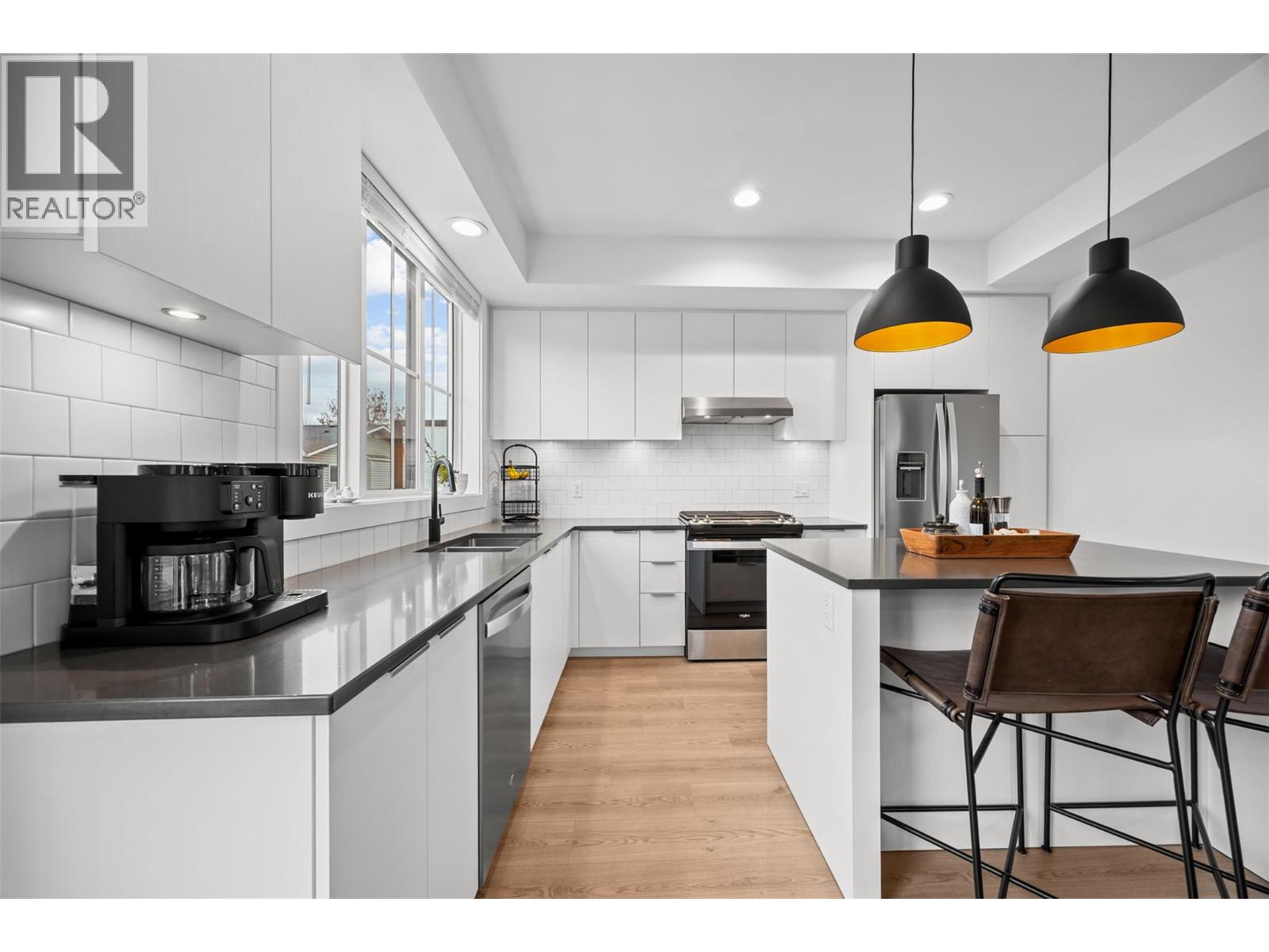 Step into bright, modern living with this beautifully upgraded 3-bedroom + den, 2.5-bath end-unit townhome in the heart of Glenmore. With extra windows and only one shared wall, this home is filled with natural light and offers the feel of a detached home - without the upkeep. (The strata even cuts your grass!) The main level is designed for effortless living and entertaining, featuring an open-concept layout, quartz countertops, stainless steel appliances, and a generous island. From the dining area, step onto your private balcony with serene mountain views - perfect for coffee at sunrise or evening unwinding. A convenient main-floor den creates the ideal office or flex space. Upstairs, find three spacious bedrooms, including a bright primary suite with a walk-in closet and a modern ensuite with heated flooring. Additional features include side-by-side laundry, ample storage, an attached garage plus driveway parking, and a welcoming front entry. Located in a highly desirable Glenmore community just minutes to shops, cafes, parks, schools, and the airport, this home offers unbeatable convenience and lifestyle. With the neighbourhood evolving under newly approved MF3r zoning, the area is positioned for ongoing growth and long-term appeal. A stylish, spacious, pet-friendly townhome—perfect for families, professionals, dog lovers, or investors seeking exceptional value in one of Kelowna’s most vibrant neighbourhoods.